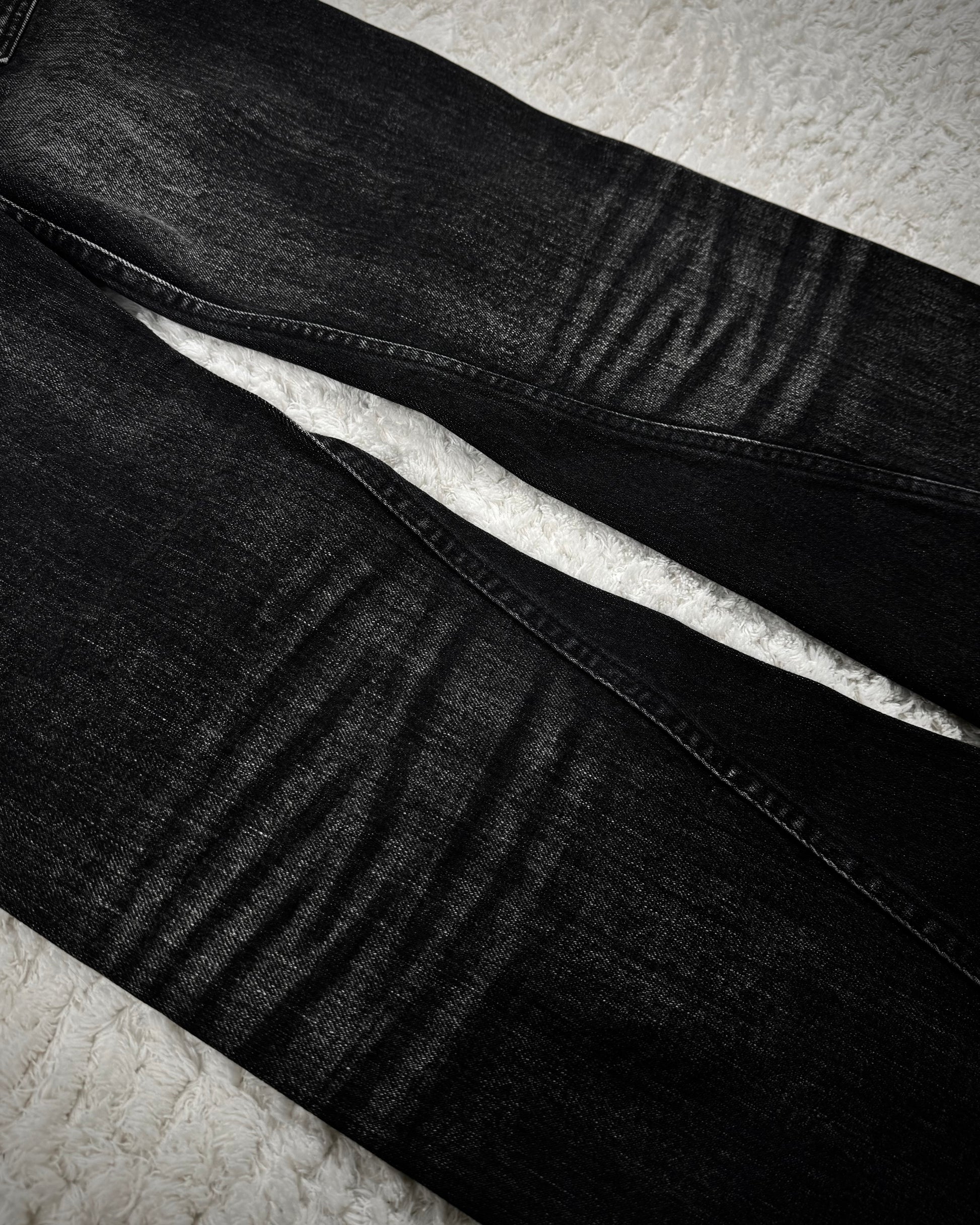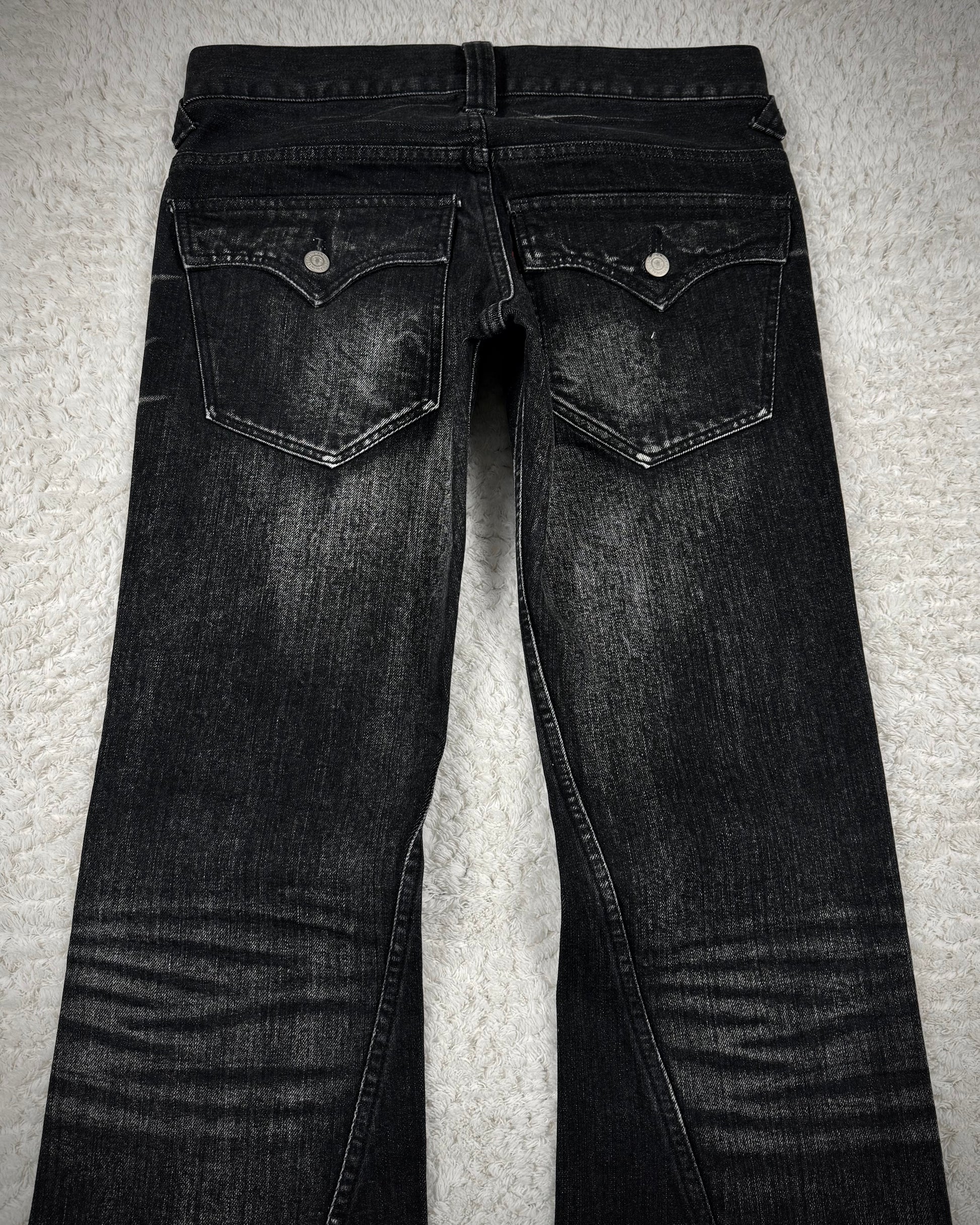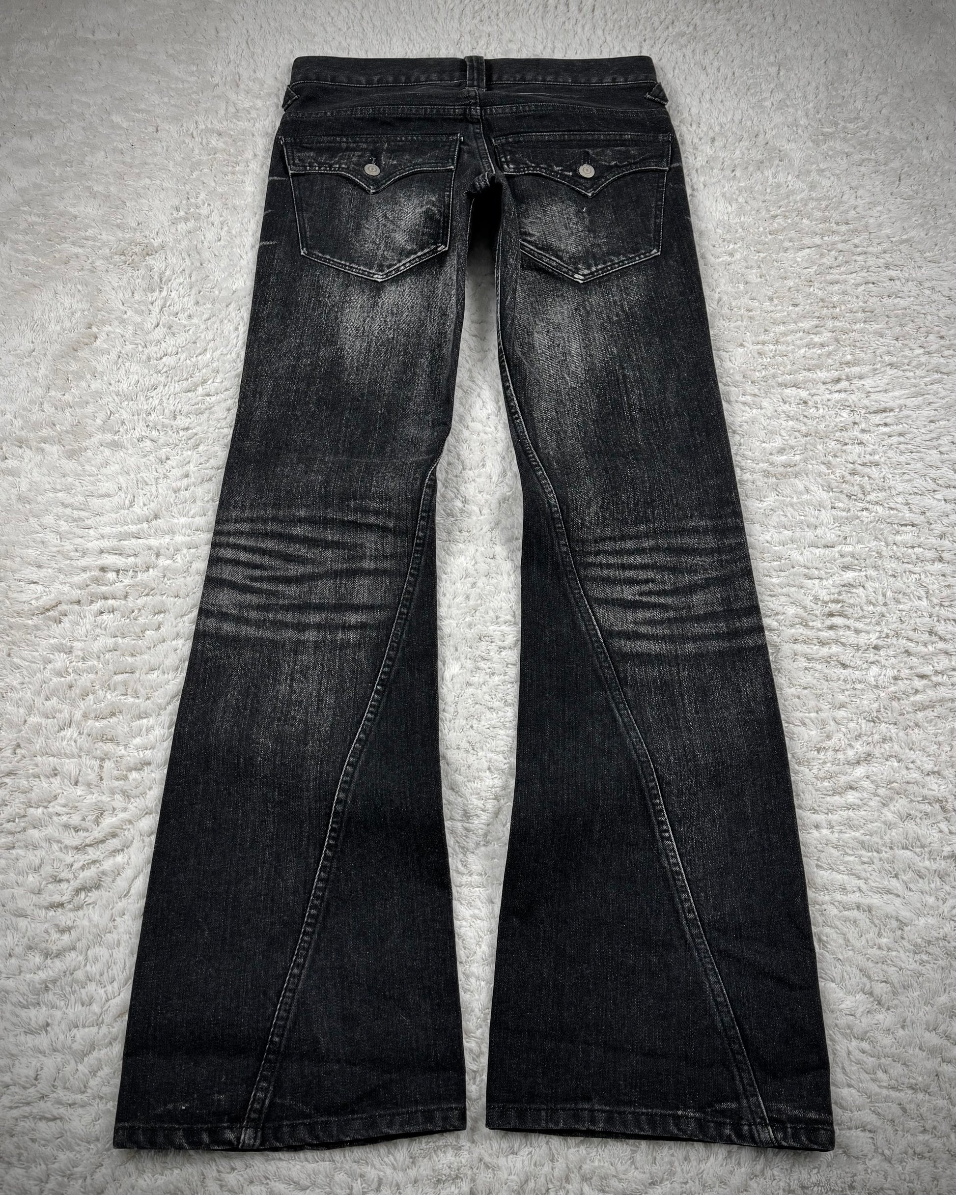 These spiral flared jeans from Japanese brand Tornado Mart feature a clawmark wash. They include flap back pockets and a matching flap coin pocket.