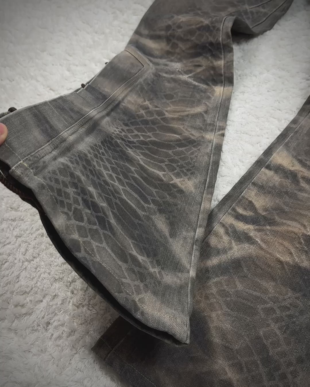 These flared jeans from Japanese brand Tornado Mart come in a unique khaki-toned color and feature crocodile pattern waxing. Hidden lace-up panels add depth to the design, and the heavy cotton construction reflects the overall high quality of the model. I also own another pair of this exact model as a personal, more worn version, which shows how much I appreciate this design.