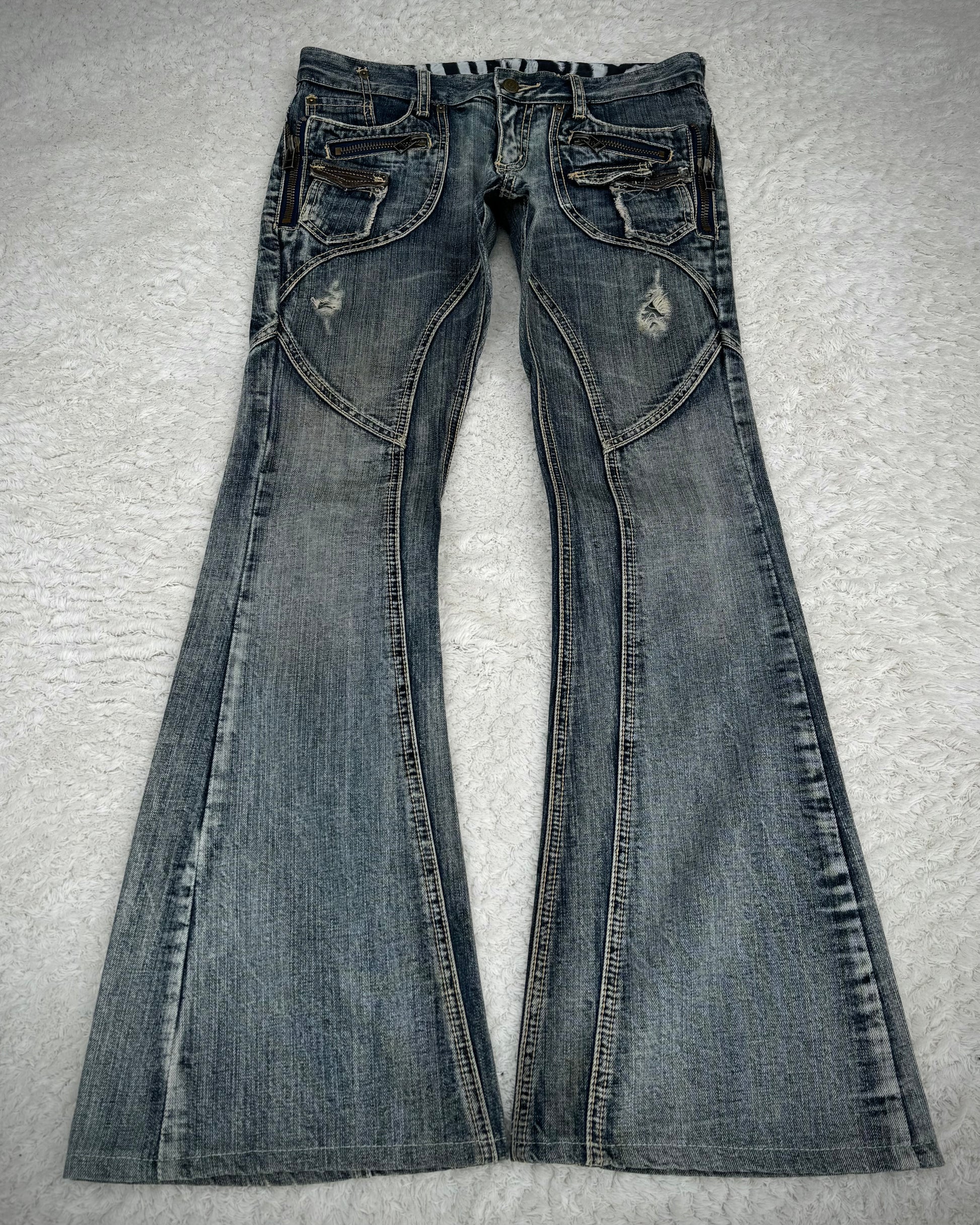 These flared jeans from Japanese brand Tornado Mart feature a distinctively paneled construction with stitching details. The design includes distressed areas on the front and back, complemented by multiple zippered pocket details. The back pockets incorporate leather trim with additional zippers, while contrast stitching provides further structure to the overall look.