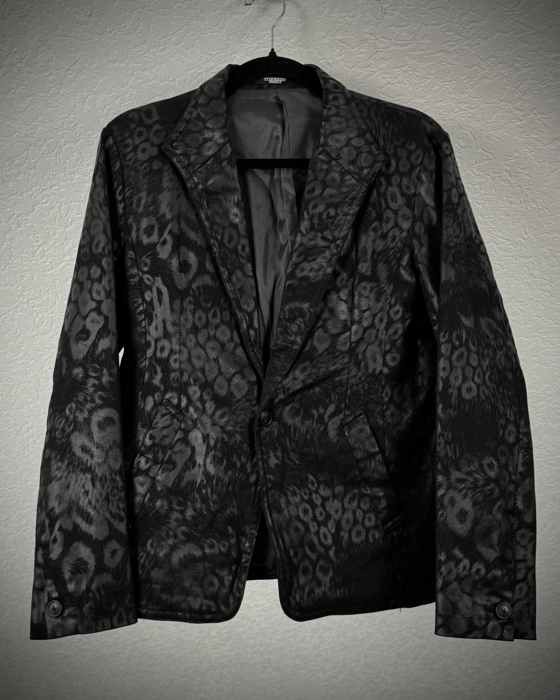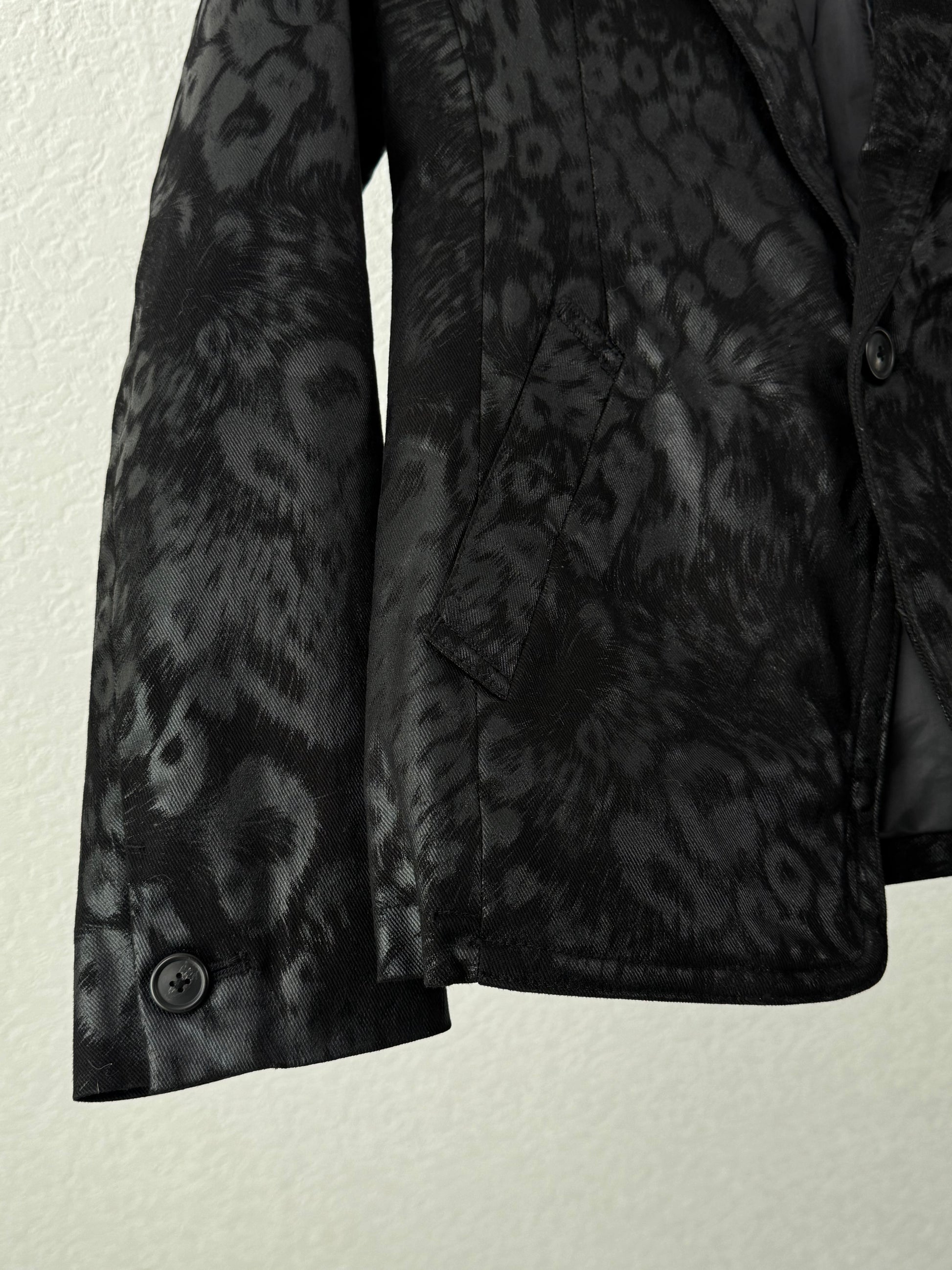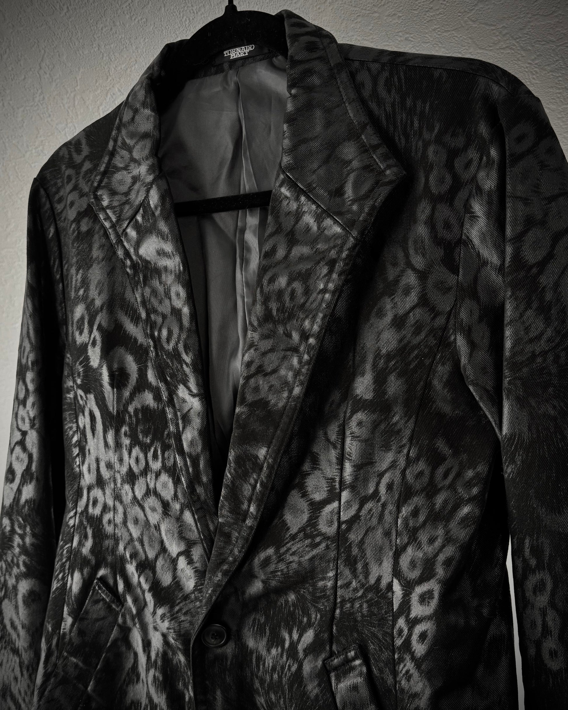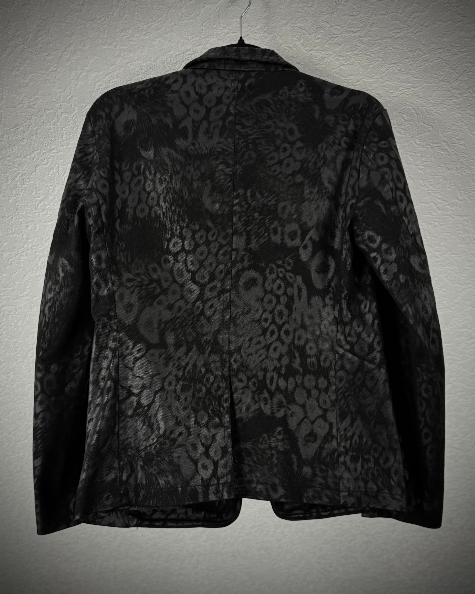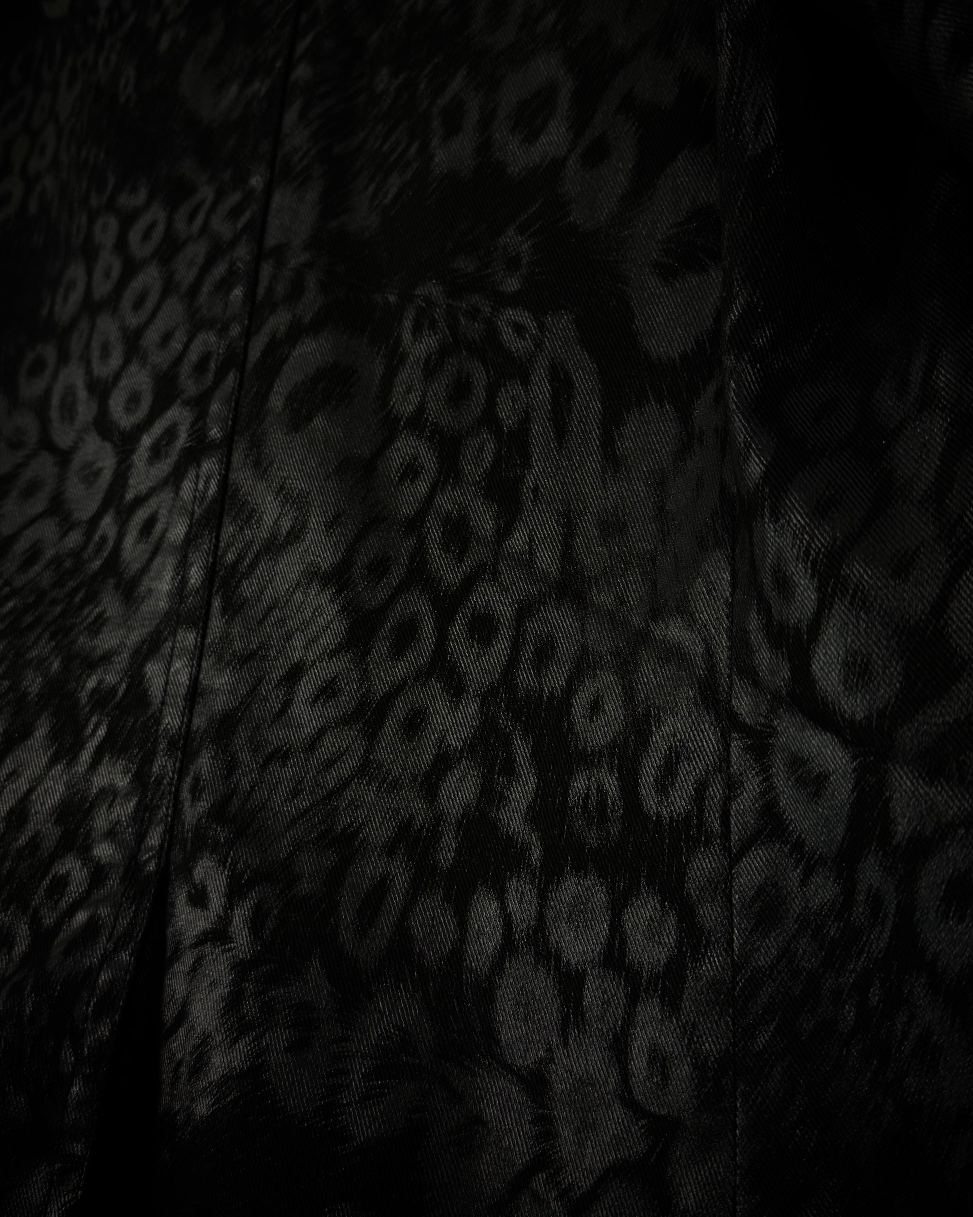 This blazer from Japanese brand Tornado Mart features an all-over leopard pattern with a waxed finish that reflects depending on the lighting. It includes slightly padded shoulders, giving the silhouette subtle structure.