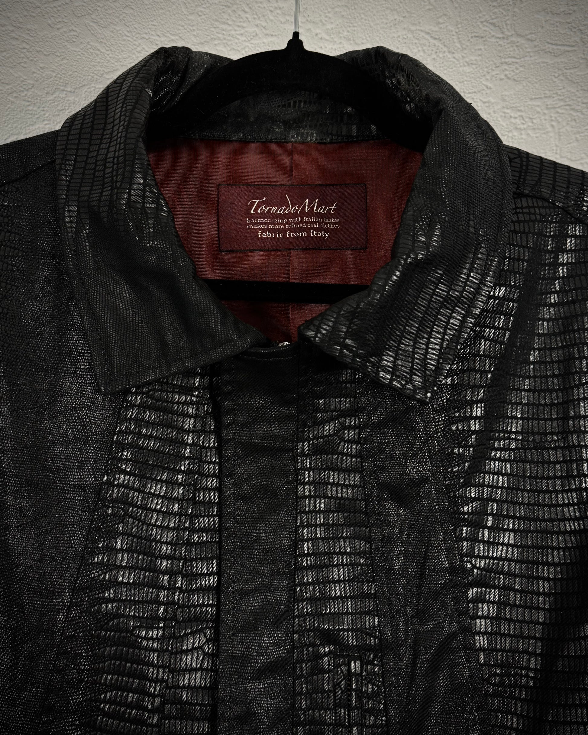 This jacket from Japanese brand Tornado Mart features a lizard-pattern coating that reflects depending on the lighting. It includes zippered cuffs that can be flared out and comes from Tornado Mart’s Italian line, known for high-quality construction and craftsmanship.