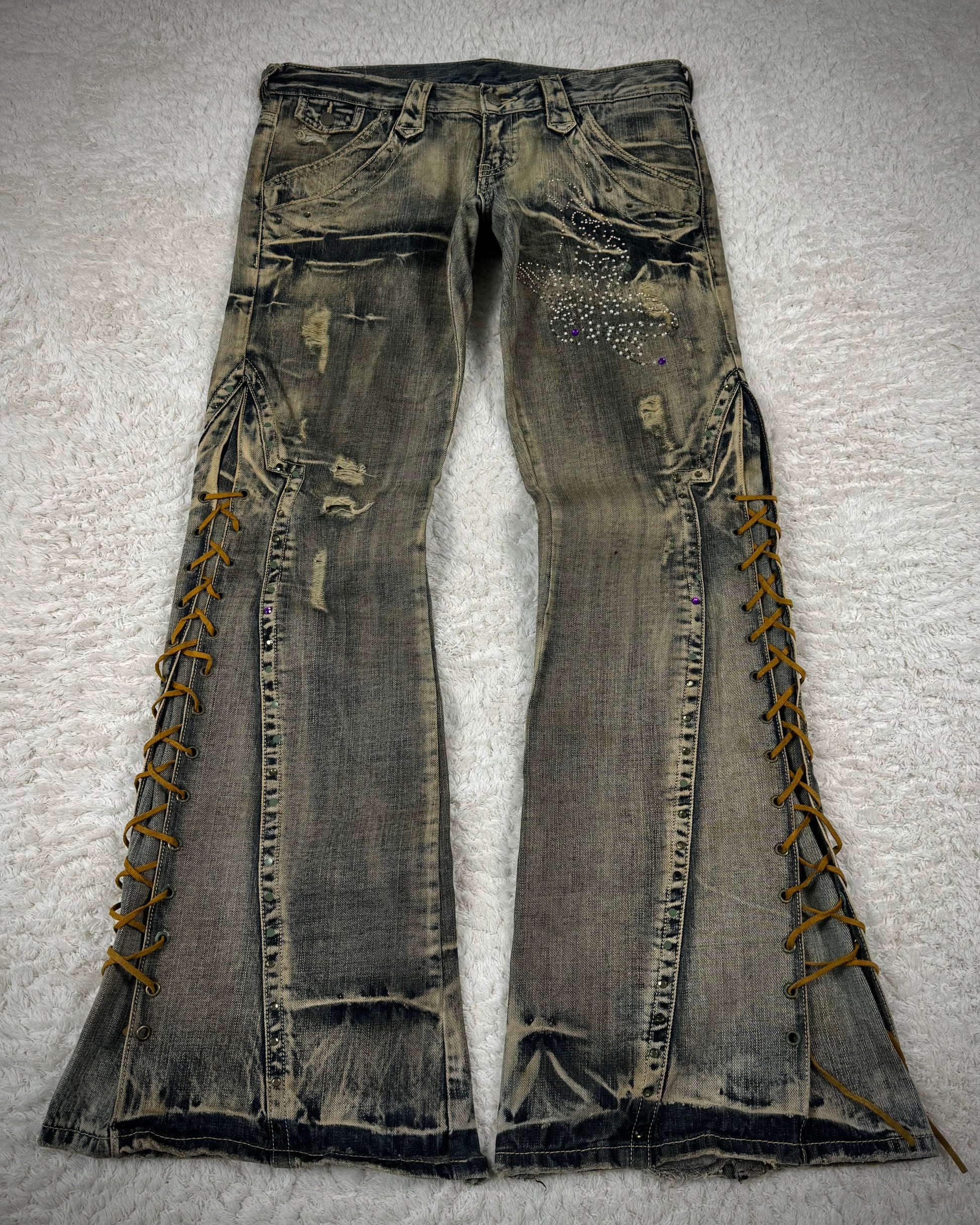 These flared jeans from Japanese brand Tornado Mart feature a mud wash and unique lace-up panels on both sides with brown leather rope. Decorative rhinestones, including a subtle butterfly design on the thigh, add detail. The jeans include flap back pockets and an overdramatic flare that can be adjusted through the lace-up panels.