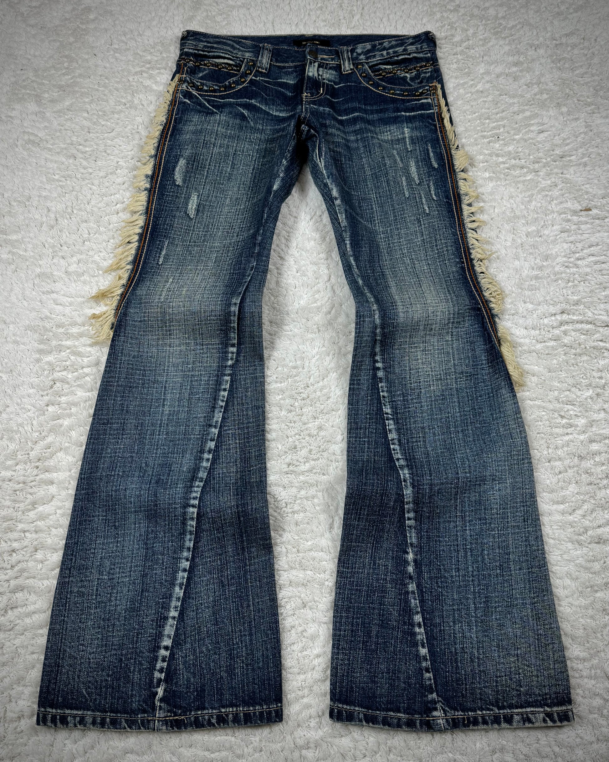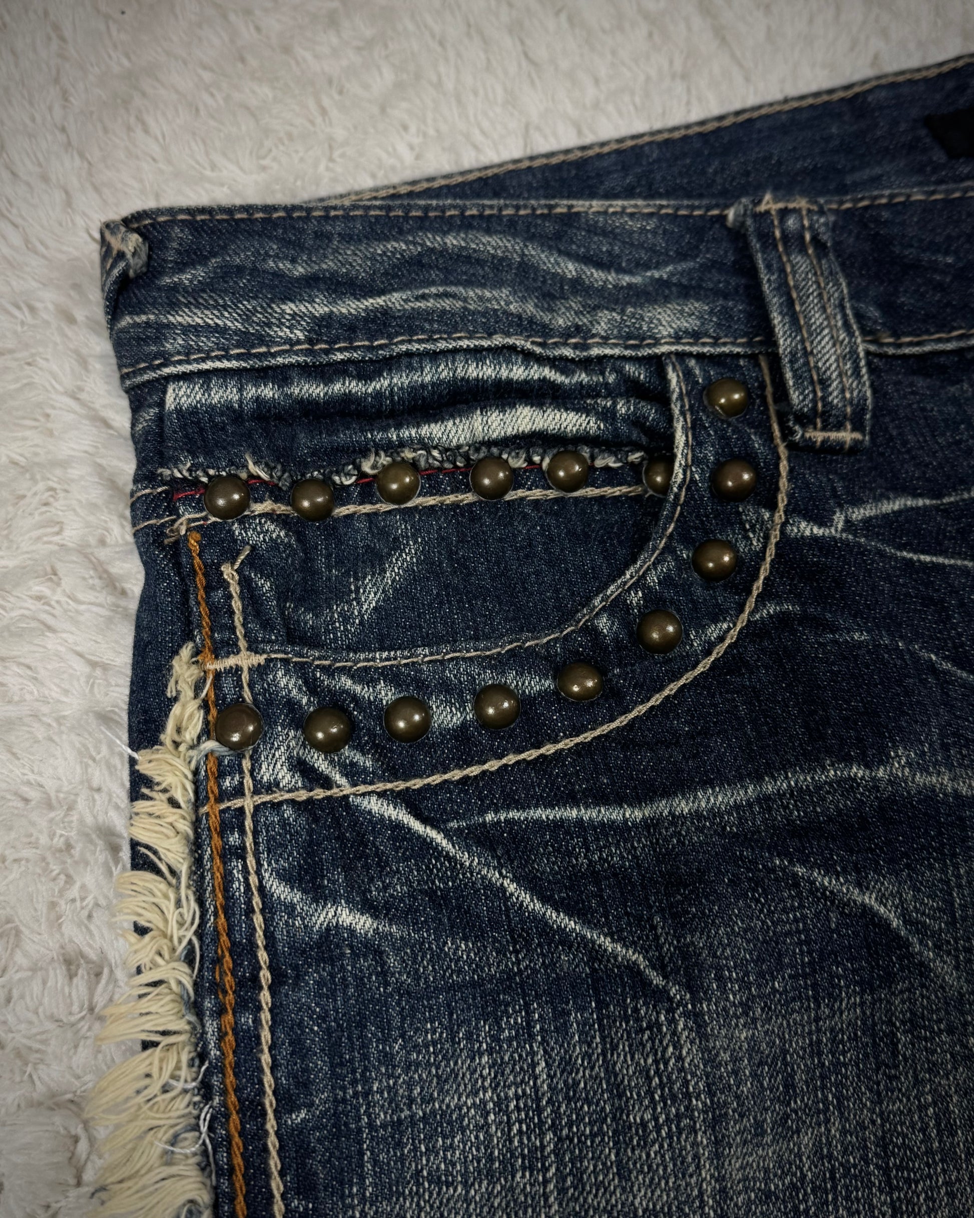 These flared jeans from Japanese brand Tornado Mart feature a fringed spiral outseam and flap back pockets with a unique shape. They are finished with a contrastful wash that enhances the texture and structure of the denim.