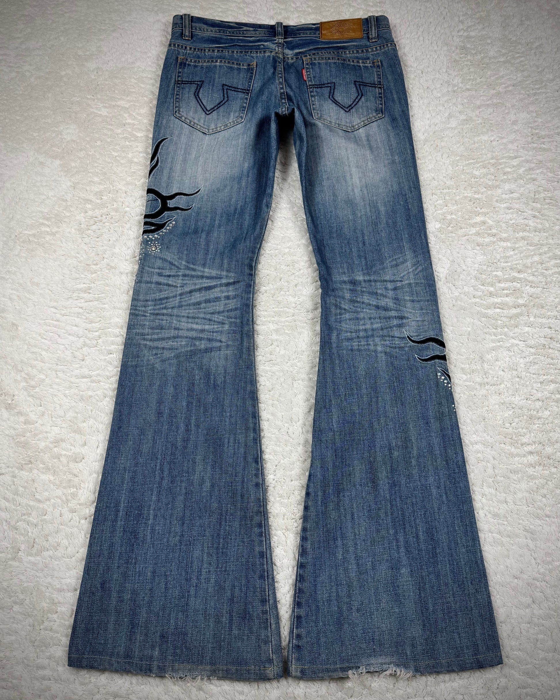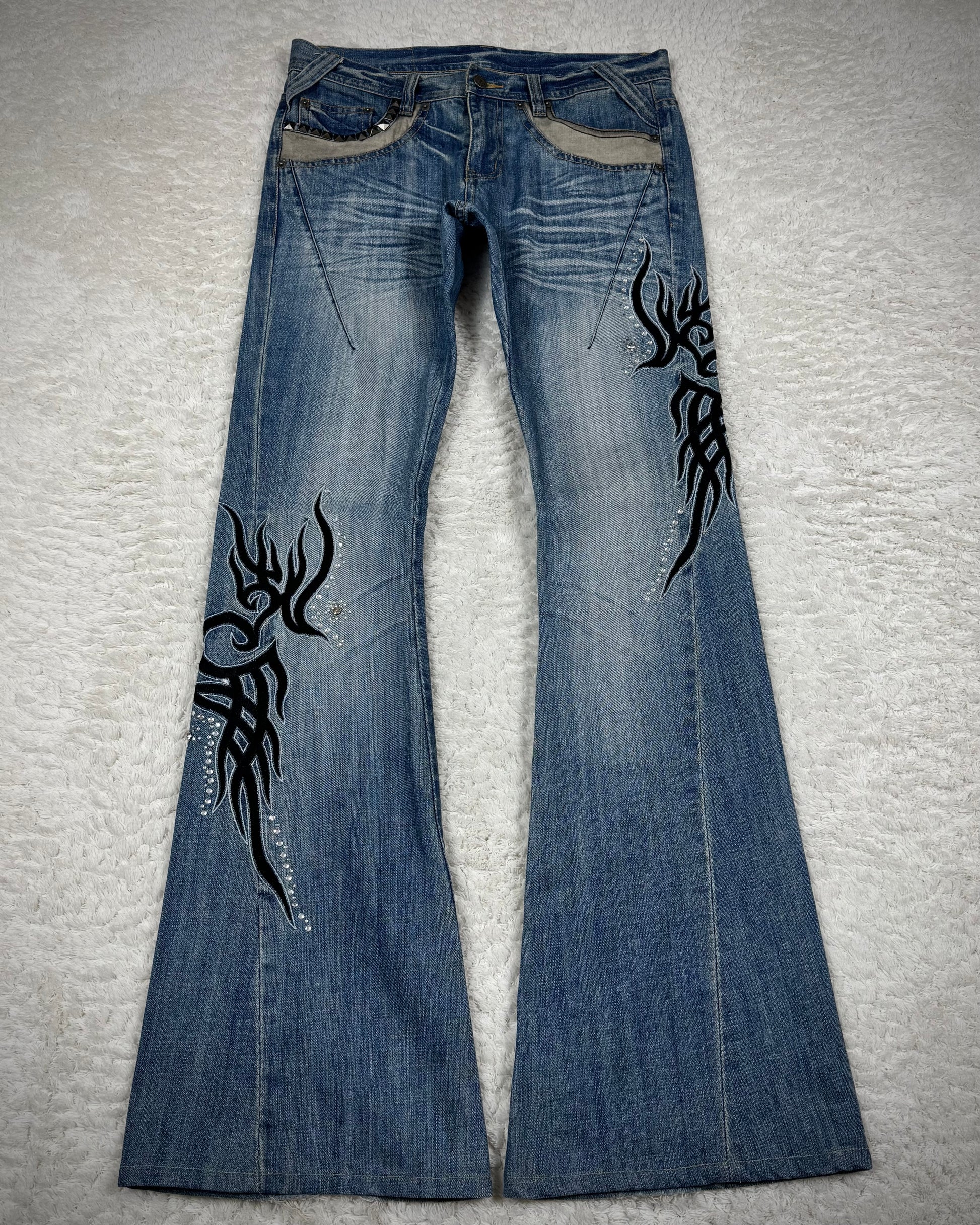 These flared jeans from Japanese brand Tornado Mart feature tribal embroideries subtly decorated with rhinestones. The design includes a studded pocket and a long inseam, creating a clean and refined silhouette.
