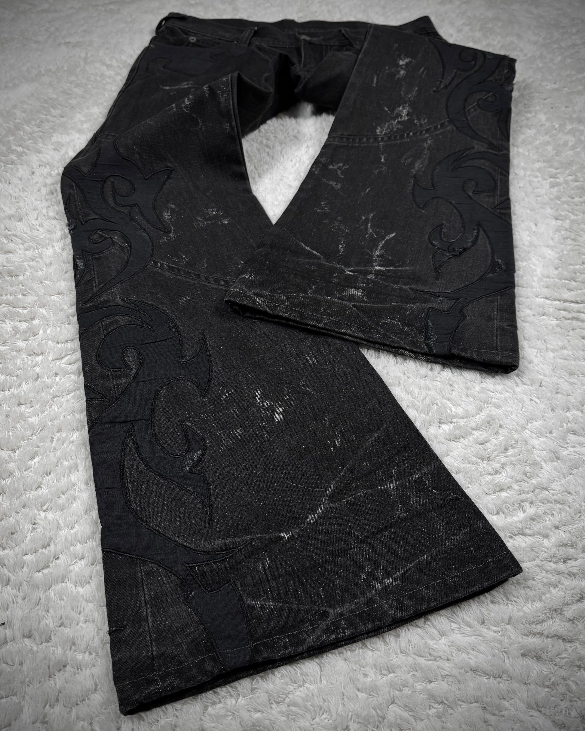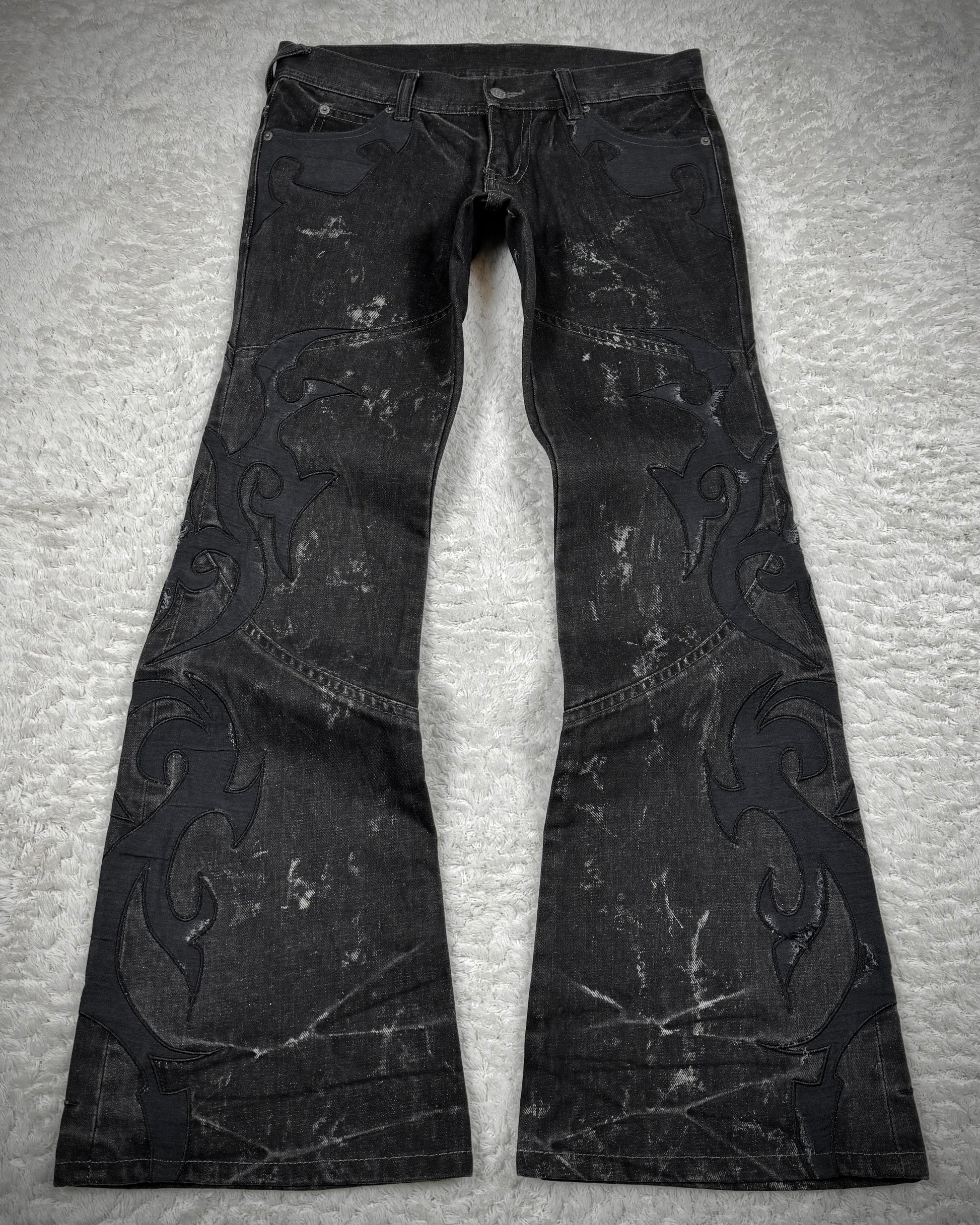 These flared jeans from Japanese brand Tornado Mart feature numerous tribal-style patches and a wash that adds texture and contrast. The flap back pockets also carry tribal patch details, making this one of the brand’s rarer tribal models.