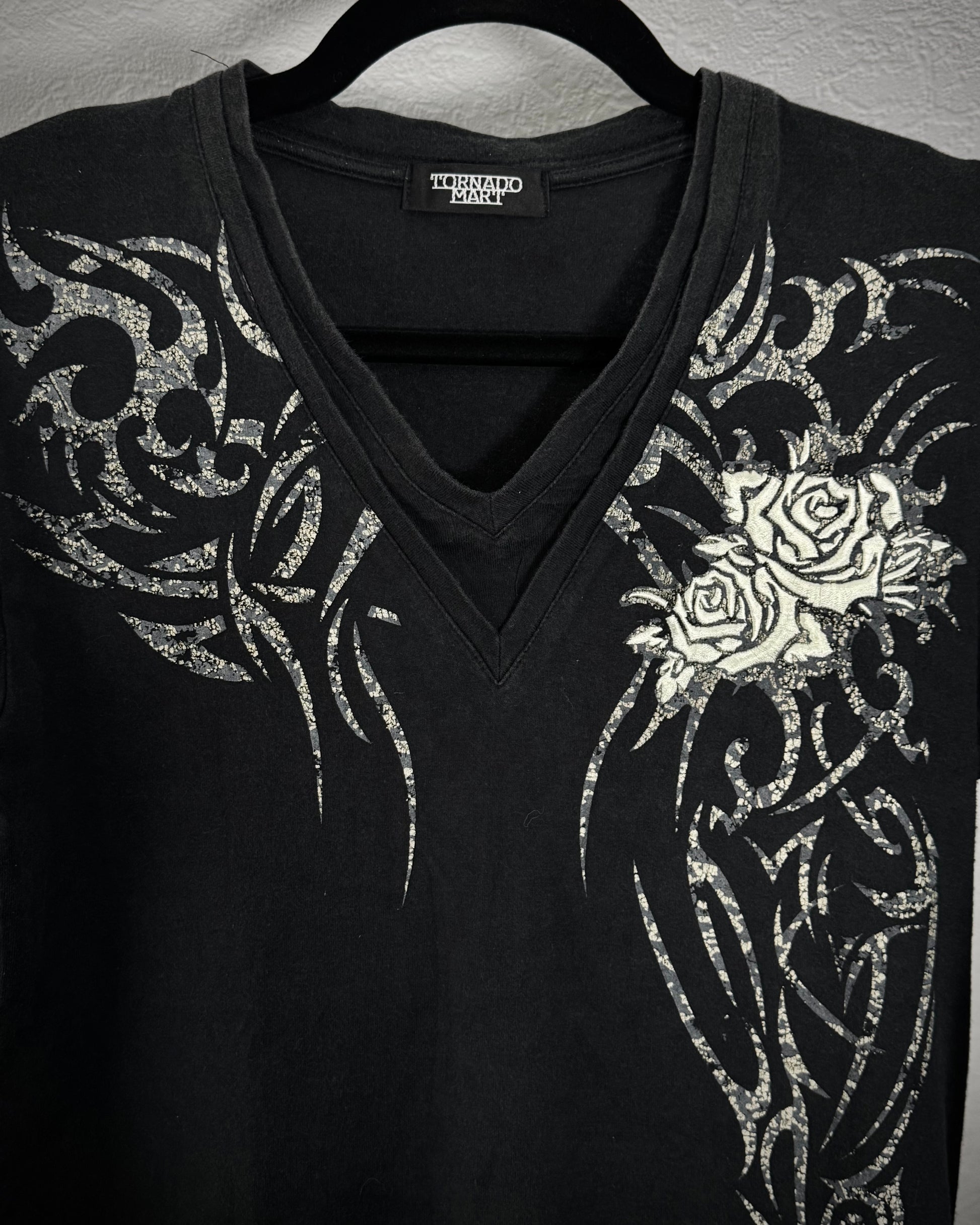 This longsleeve shirt from Japanese brand Tornado Mart features textured tribal pattern prints, tribal rose embroidery, and a double layered v-neck collar.