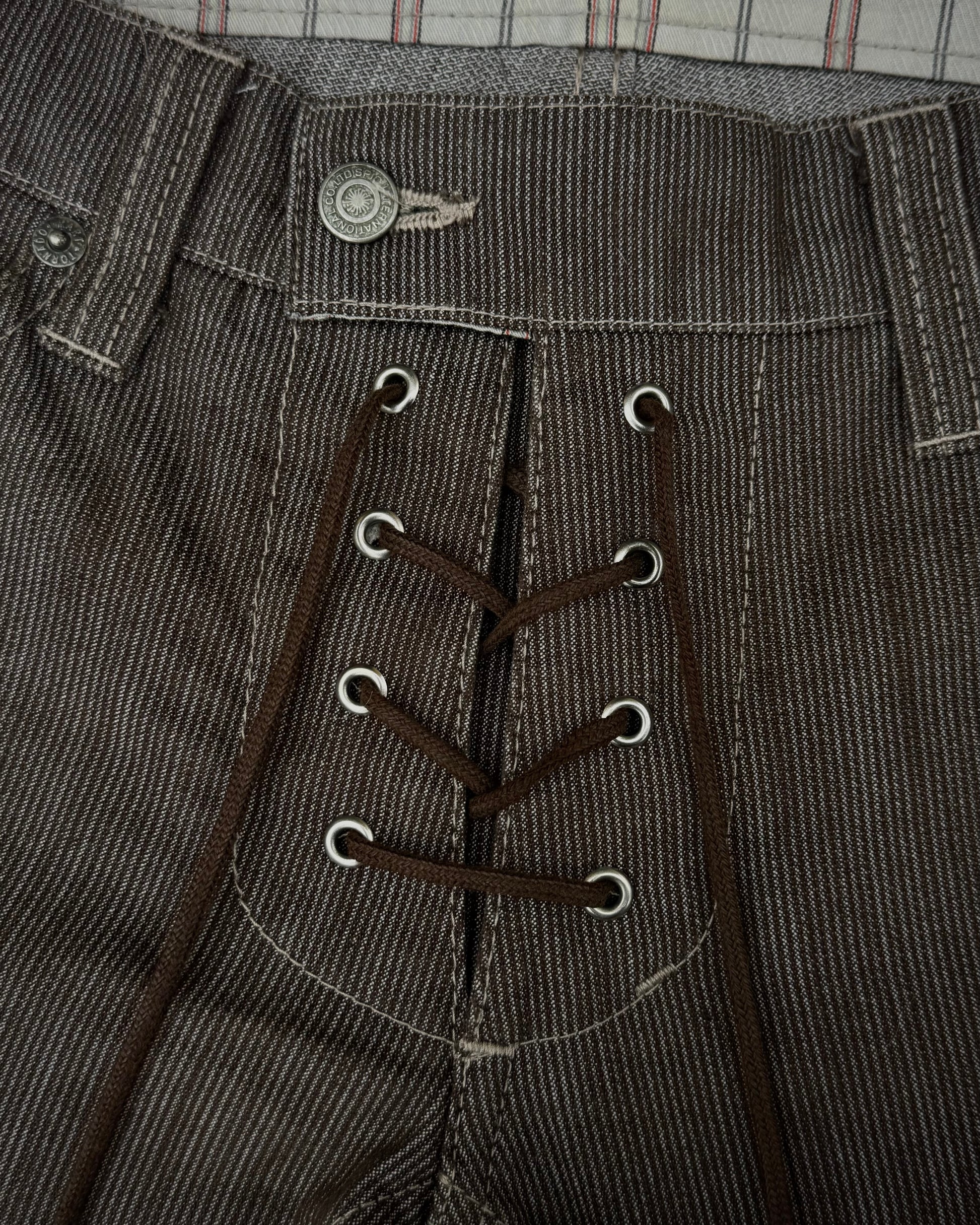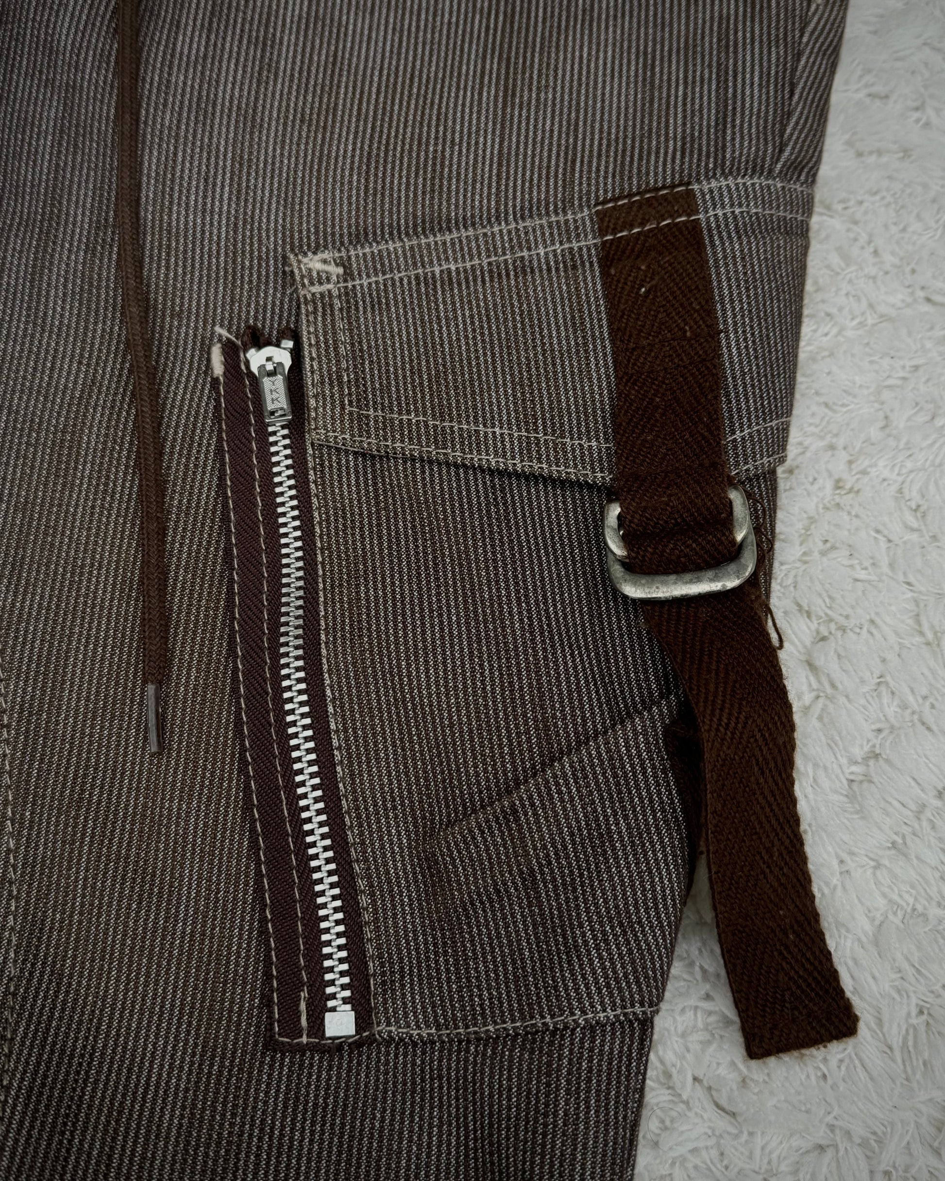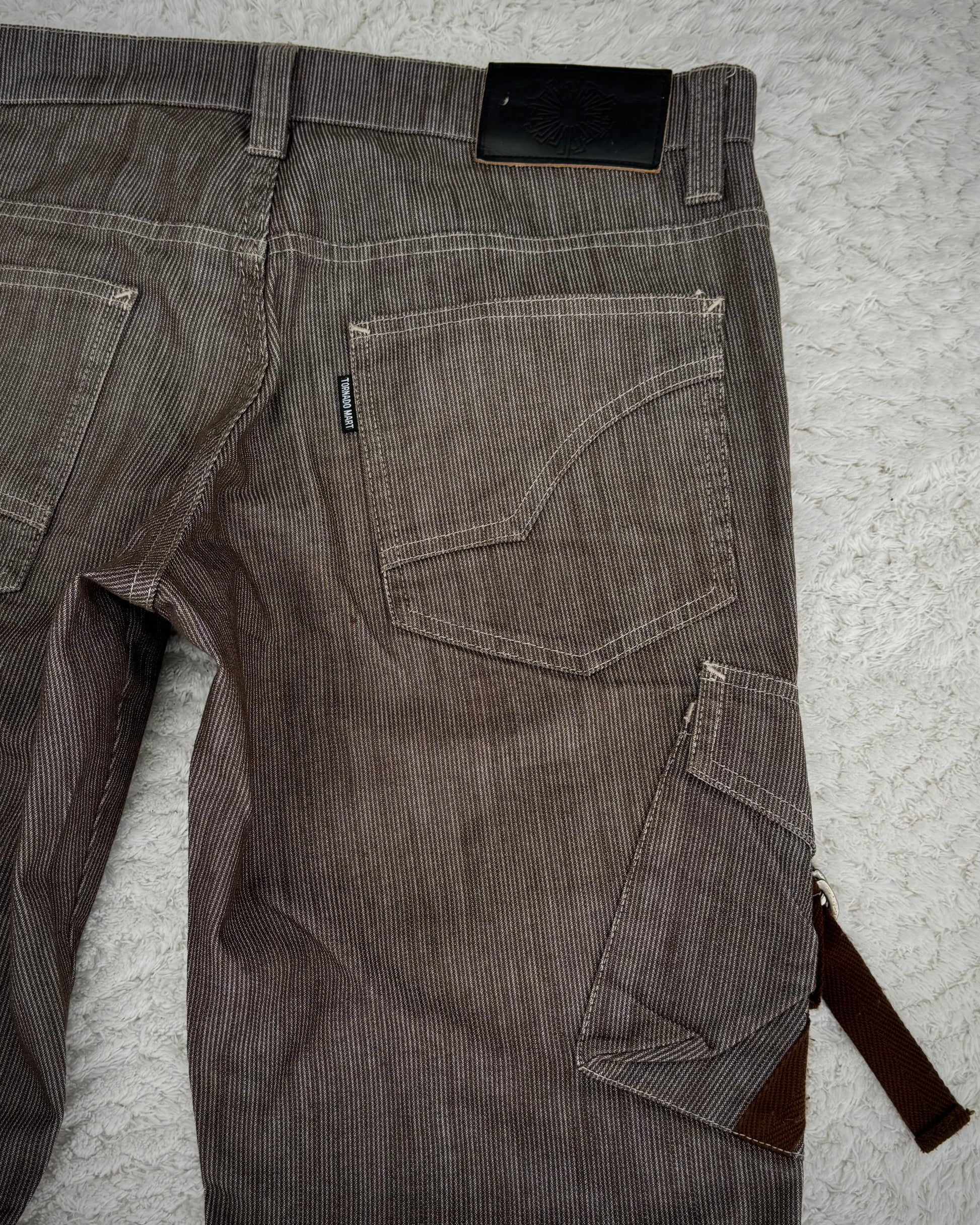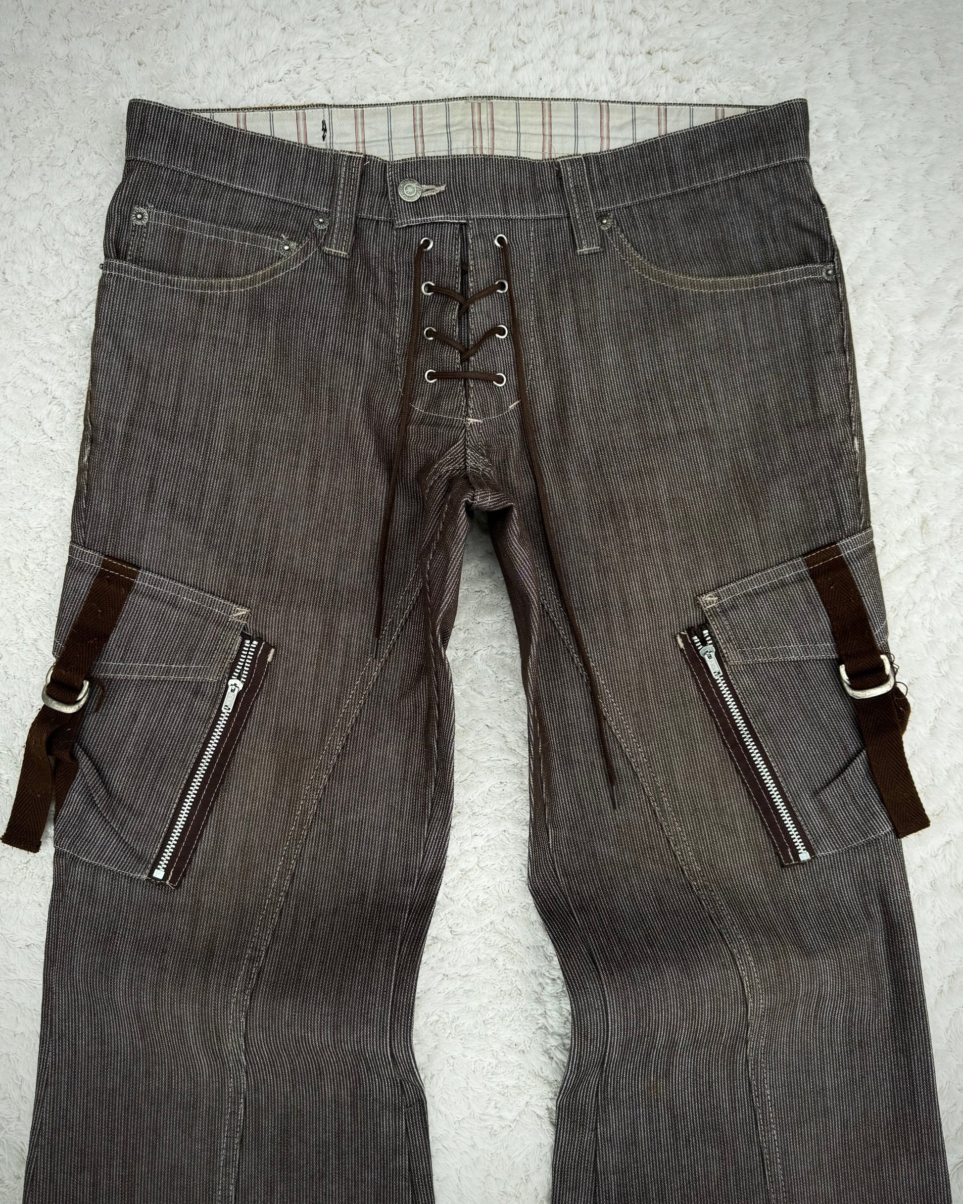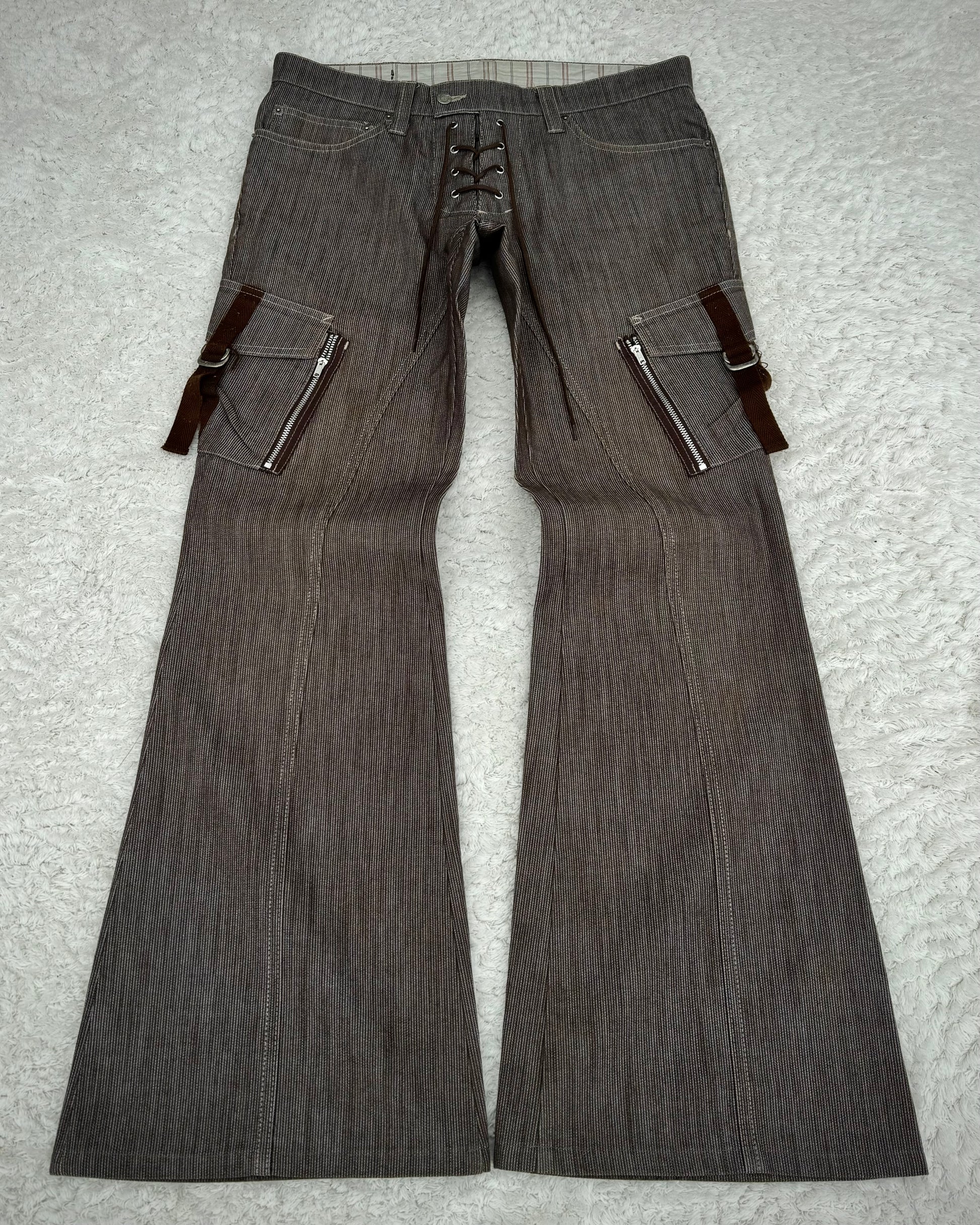 These flared pants from Japanese brand Tornado Mart feature a lace-up crotch and a vintage-inspired aesthetic. They include two cargo-style pockets equipped with zippers and belted straps, enhancing the detailed construction.