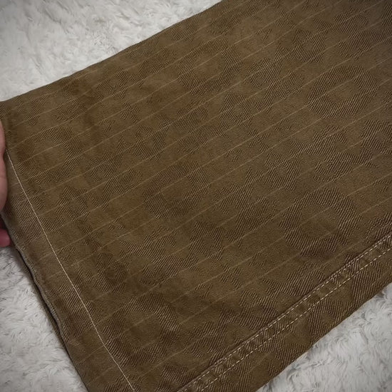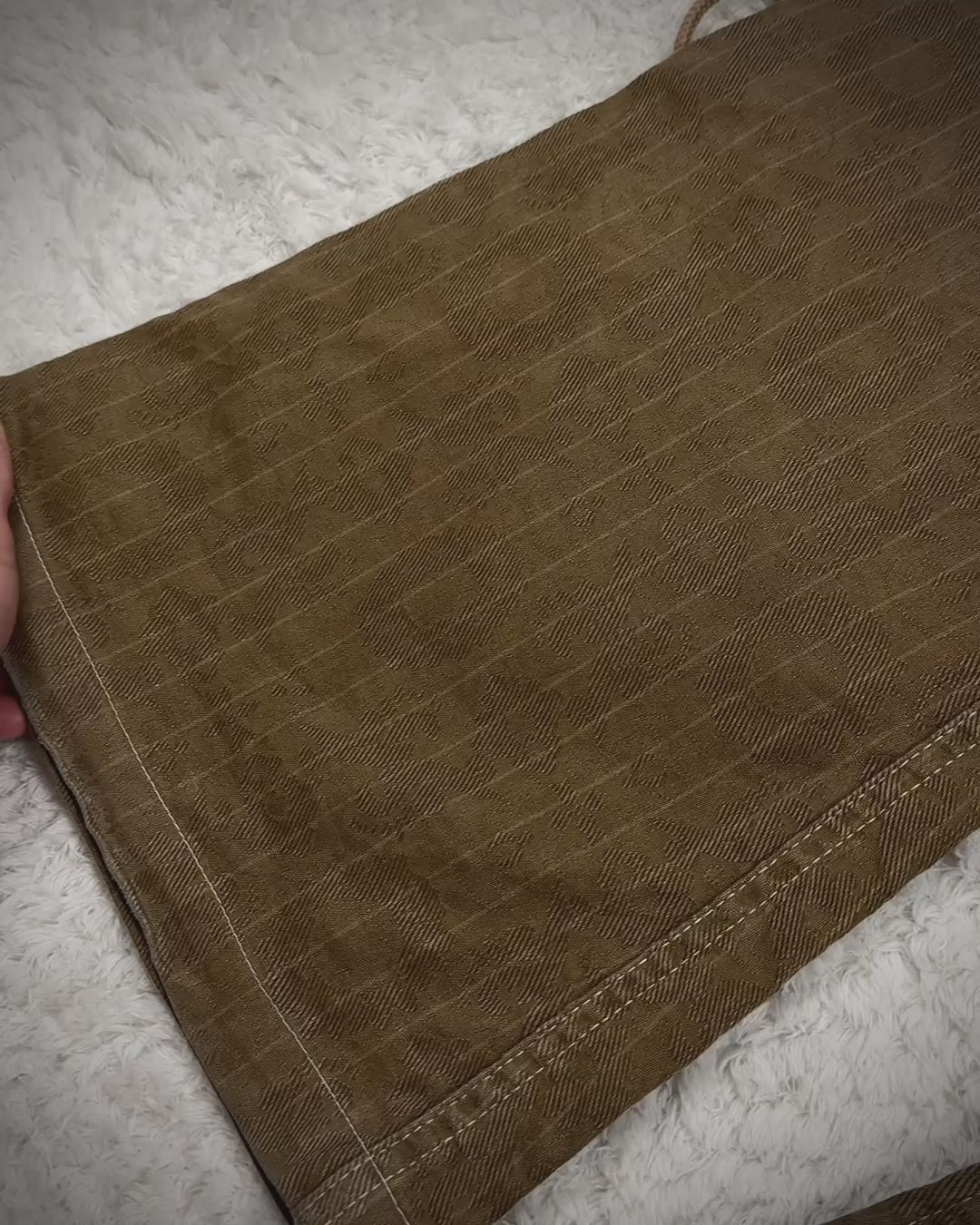 These flared pants from Japanese brand Tornado Mart feature a vintage woven pattern integrated into the seam structure, creating a textured appearance that reacts to lighting. They include lace-up panels and a very wide flare.
