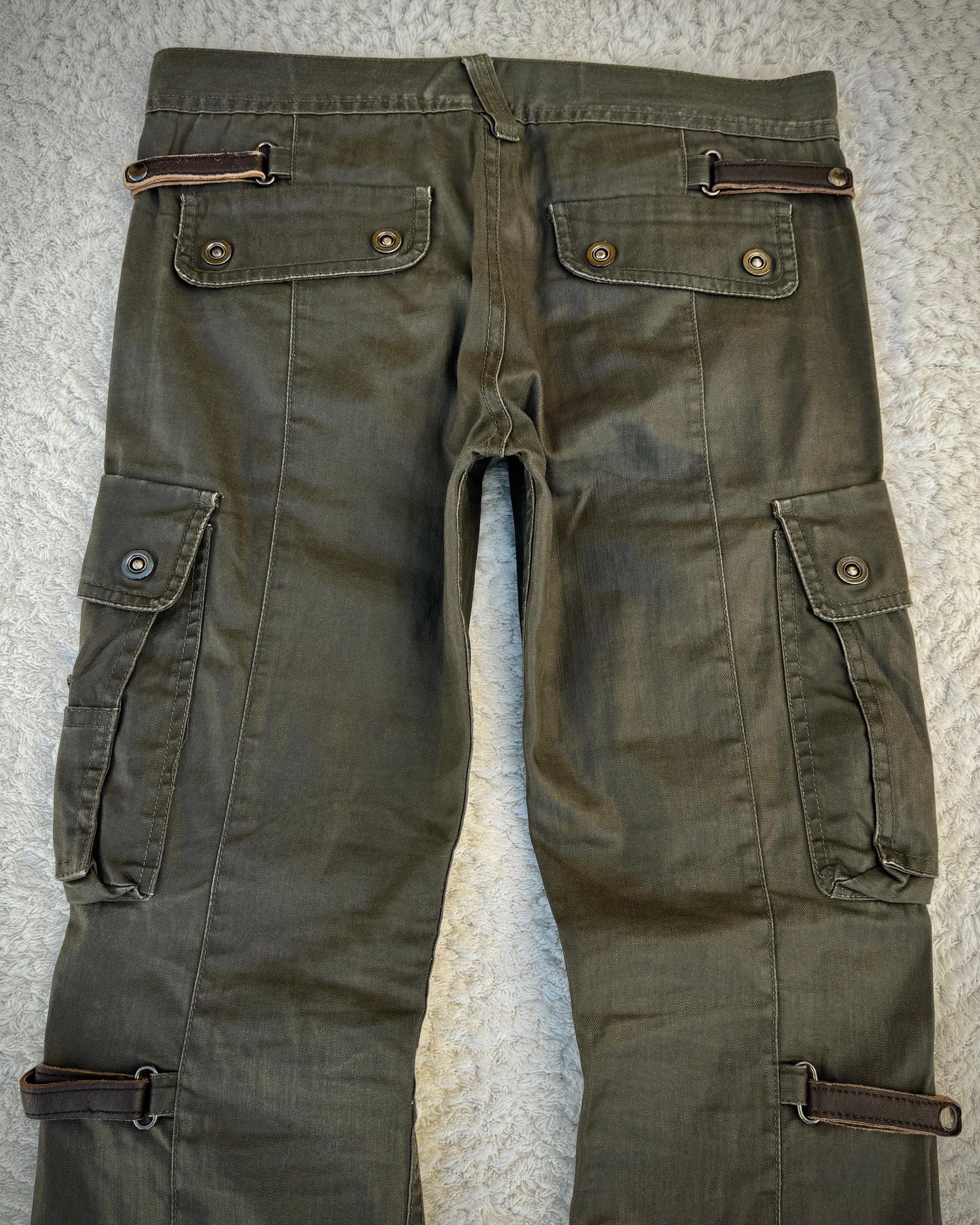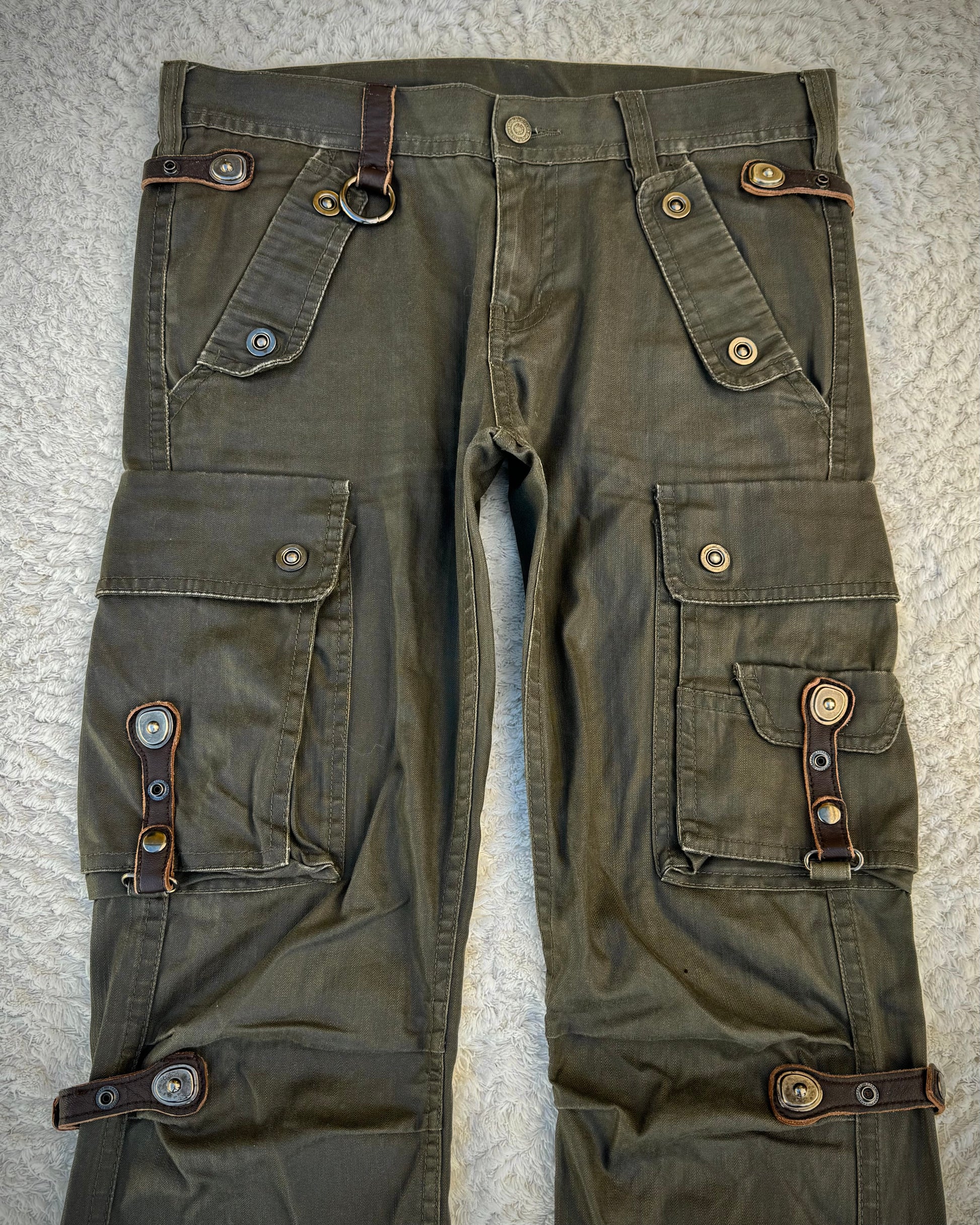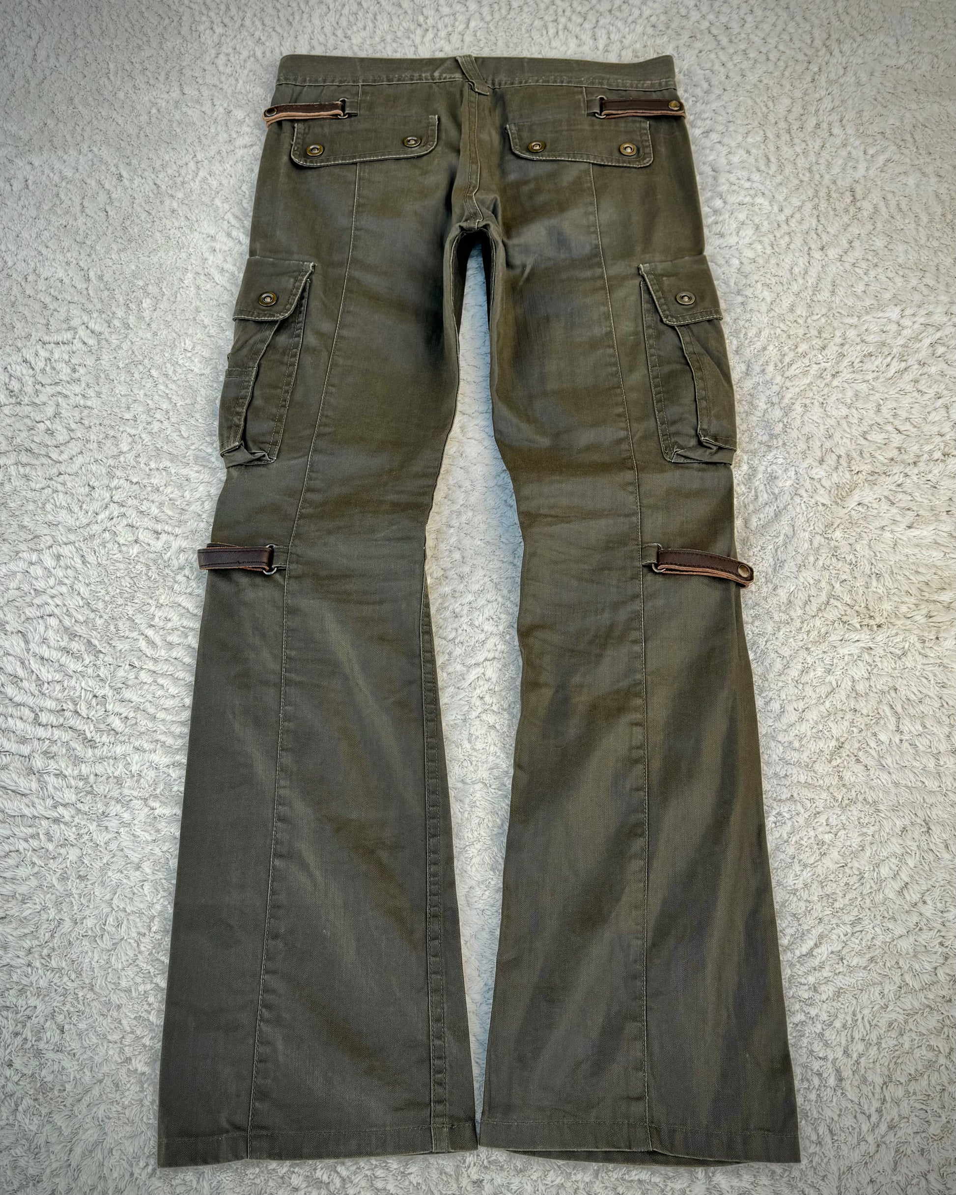 These bootcut cargo pants from Japanese brand Tornado Mart are made from waxed olive green cotton. They feature gas mask leather straps and various pockets.