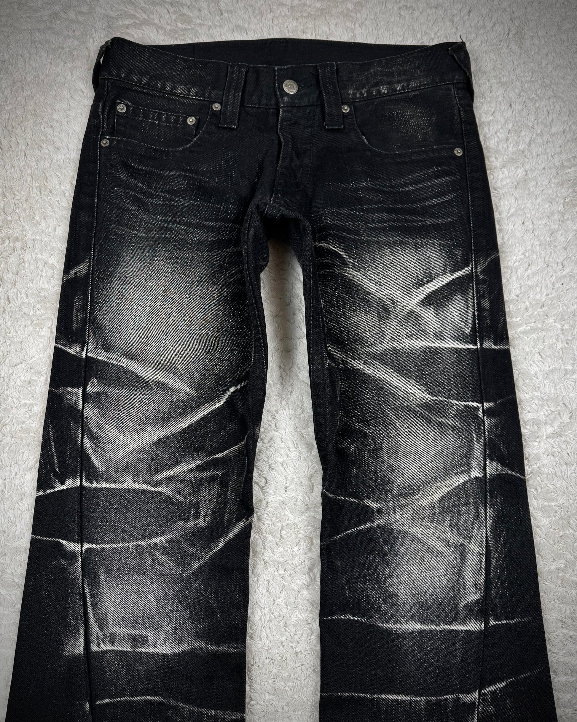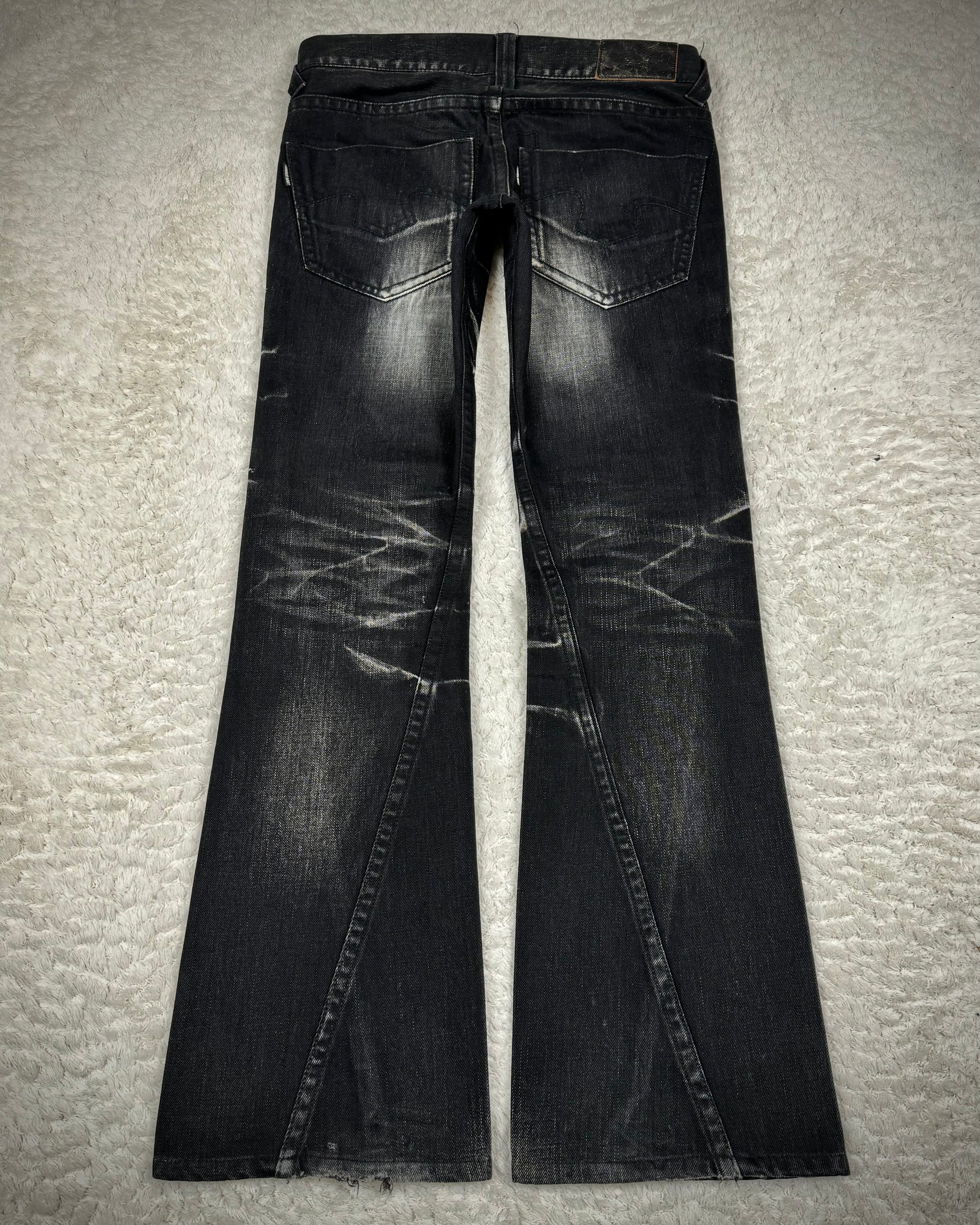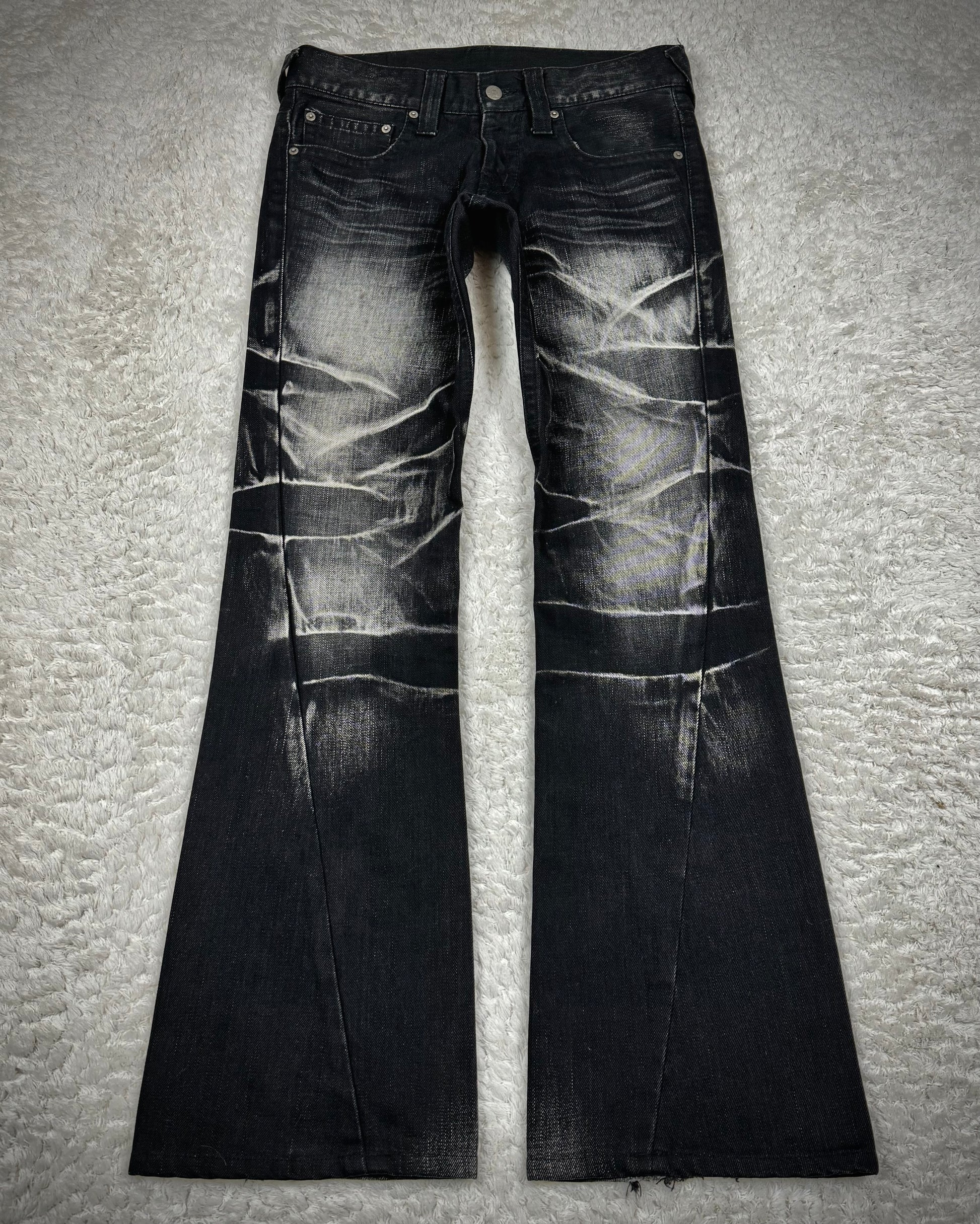 These flared jeans from Japanese brand Tornado Mart feature a whisker wash and a spiral cut. The wash creates contrasting tones throughout the fabric.