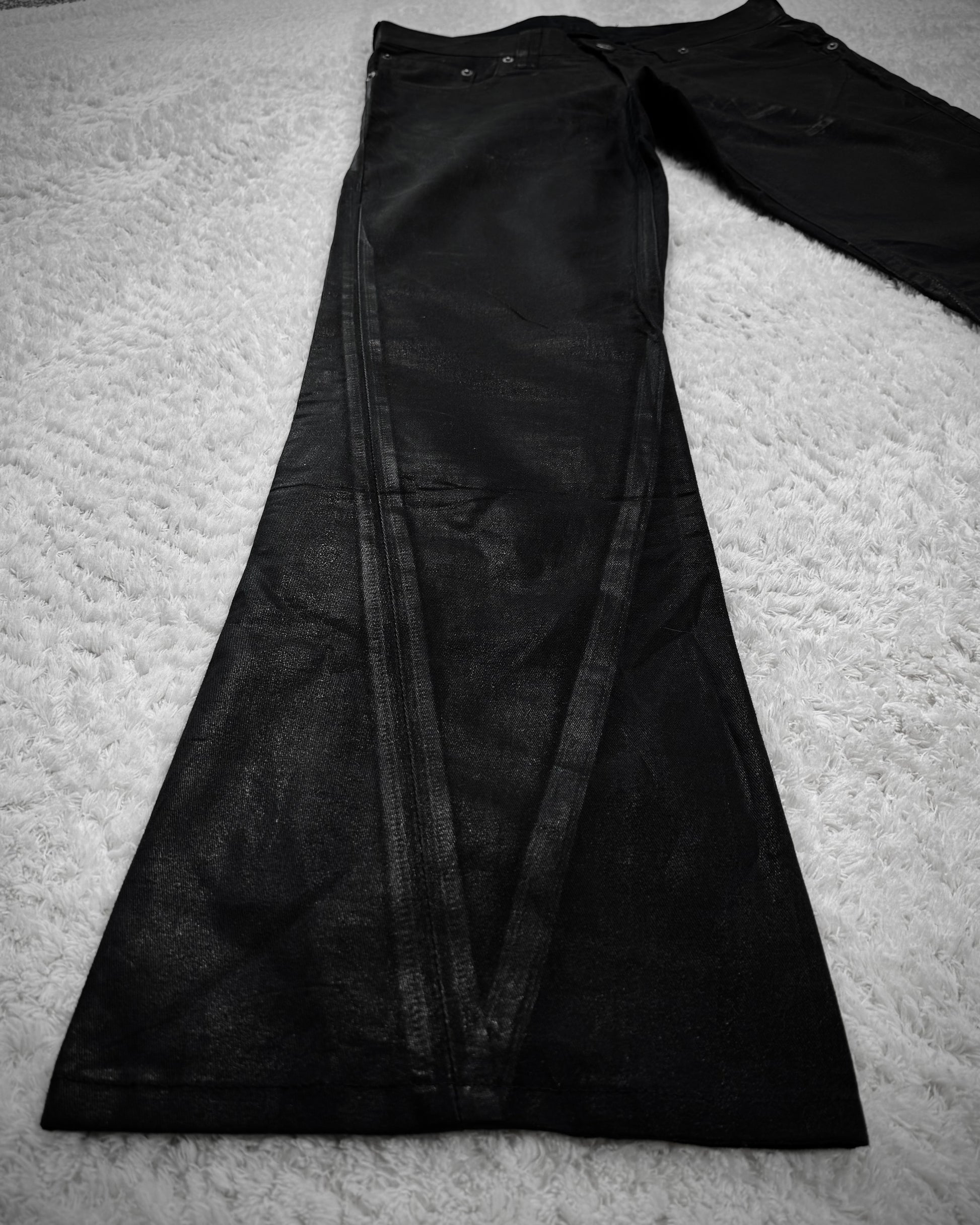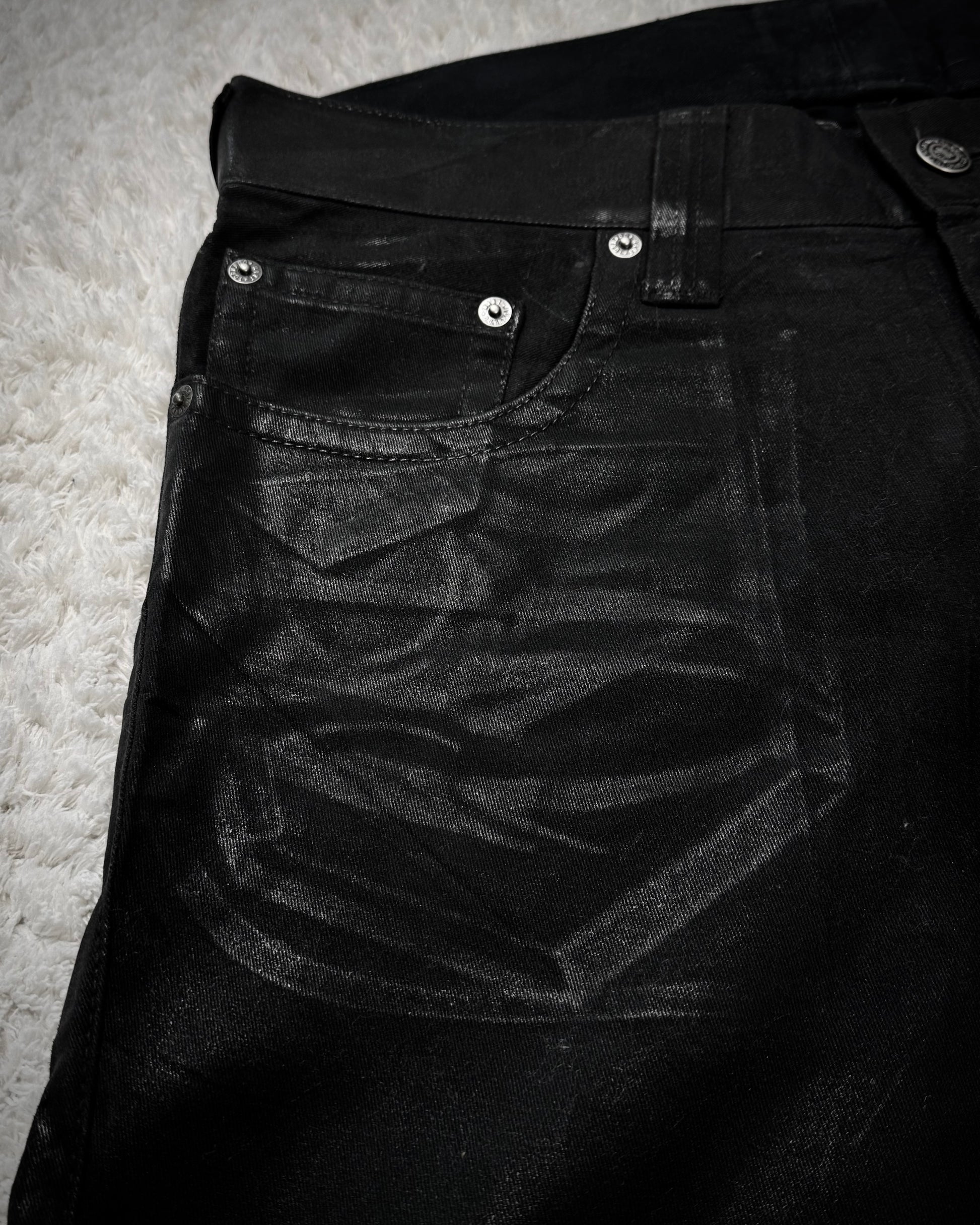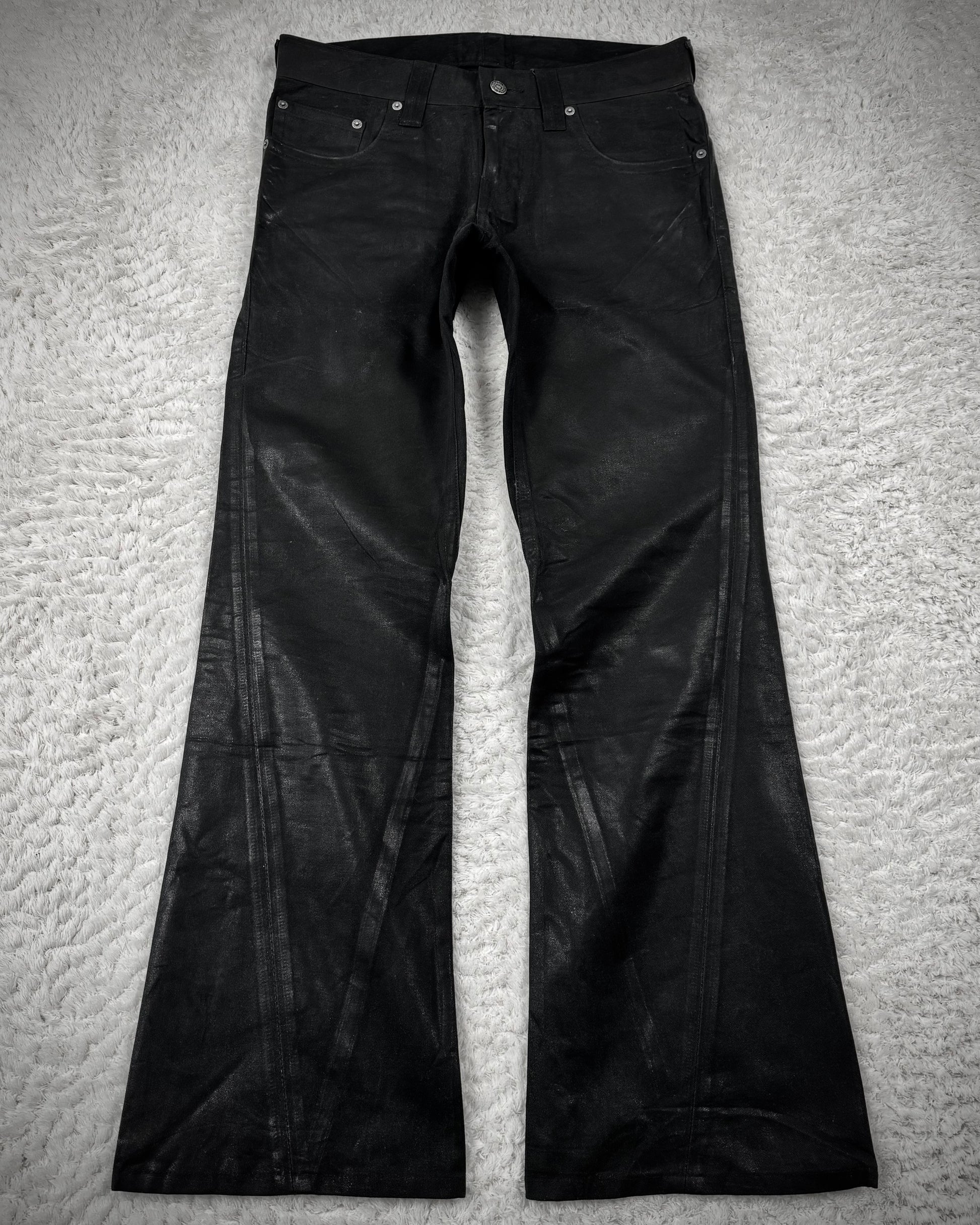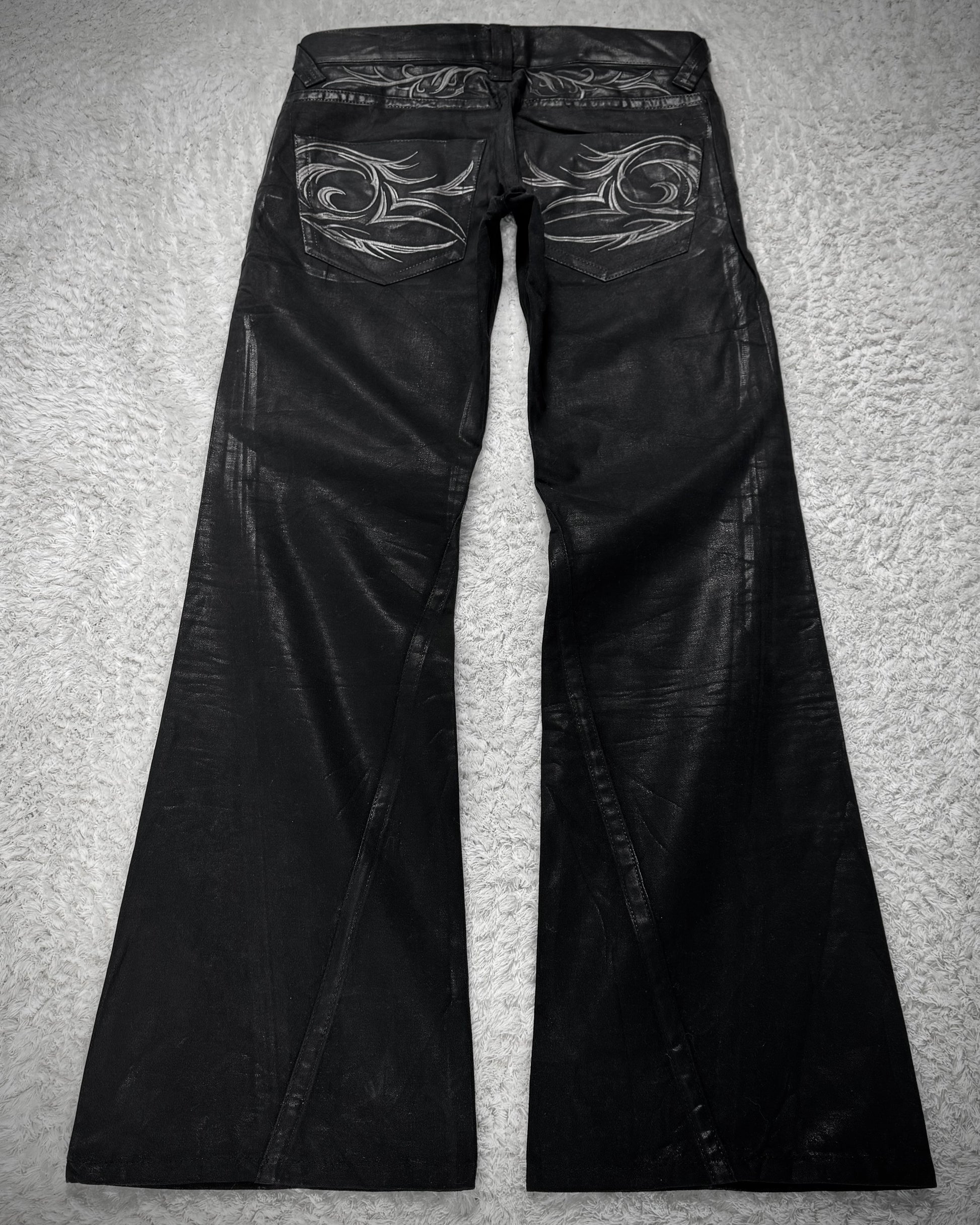 These flared jeans from Japanese brand Tornado Mart feature an all-over waxed finish that especially highlights seams and outlines, creating an X-ray-like appearance. Tribal embroideries decorate the back pockets and back waist.