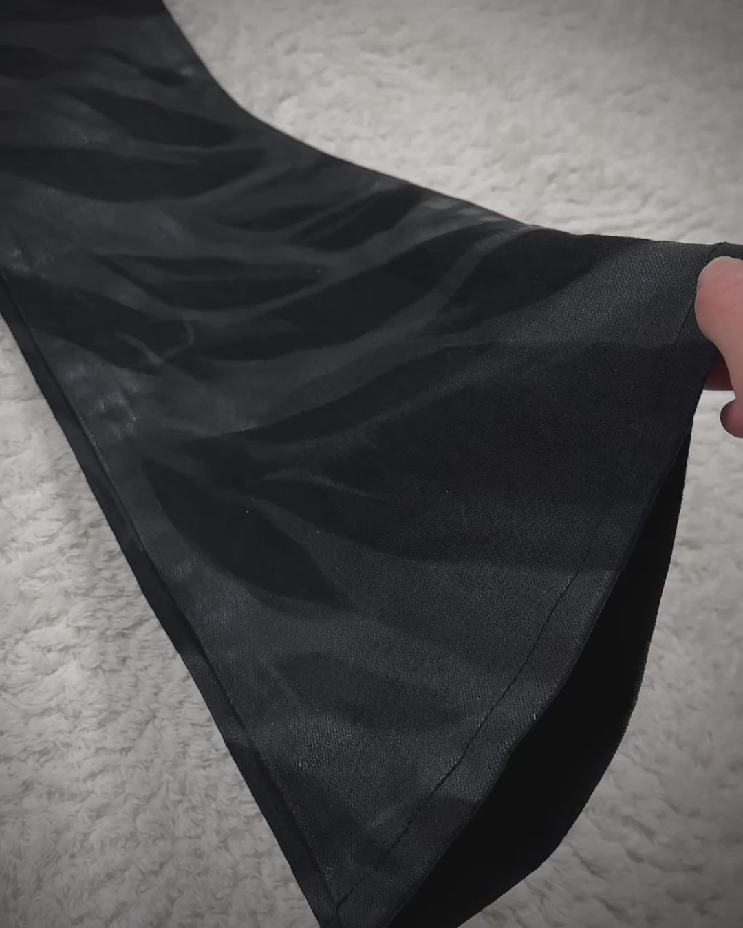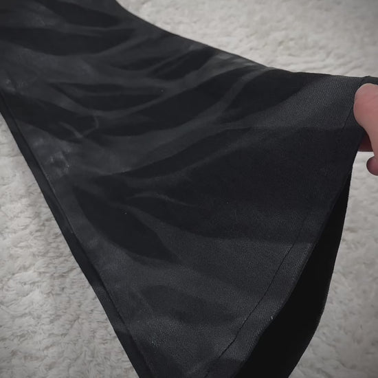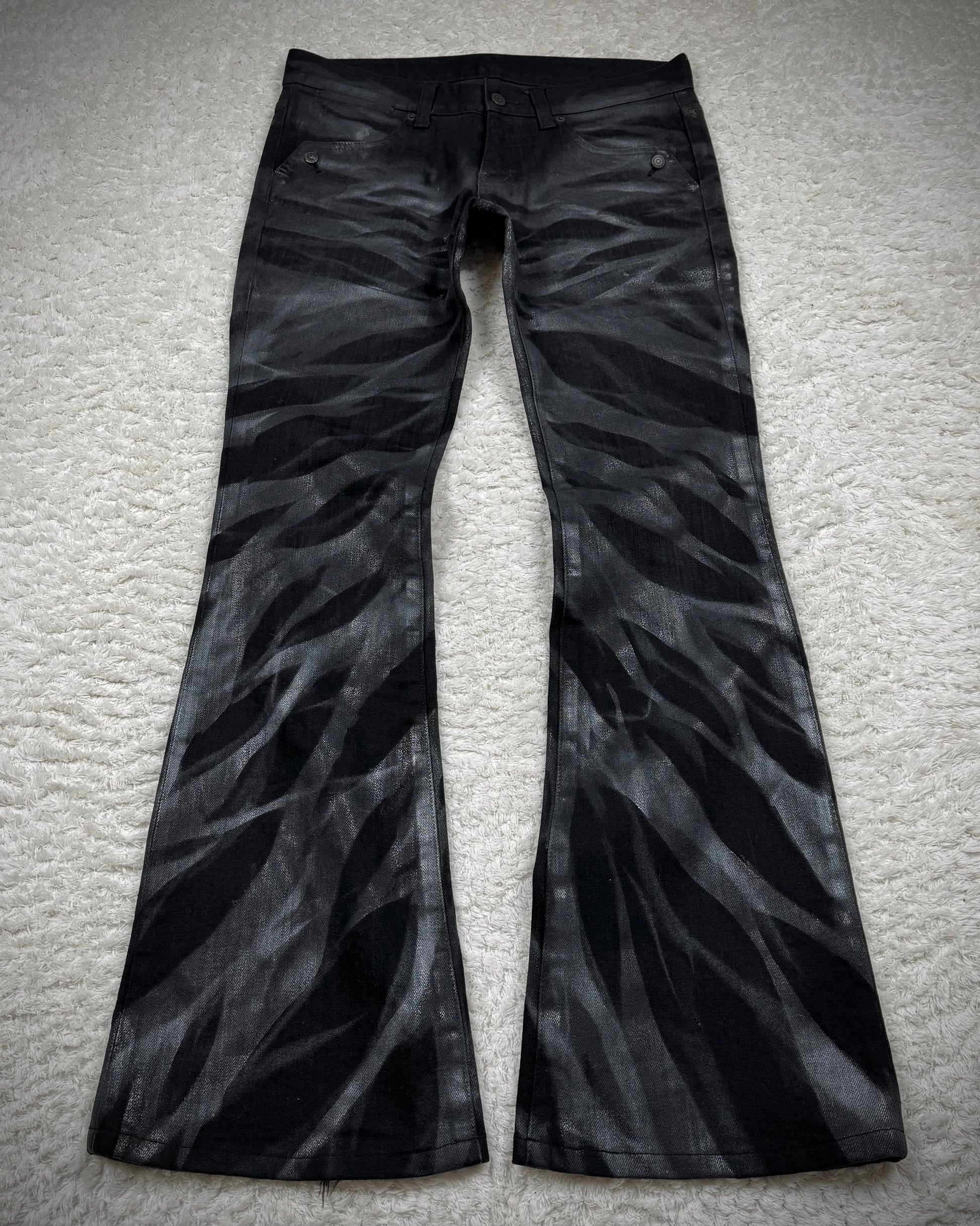 These flared jeans from Japanese brand Tornado Mart feature heavy waxing in a zebra pattern. They include subtly buttoned front pockets.