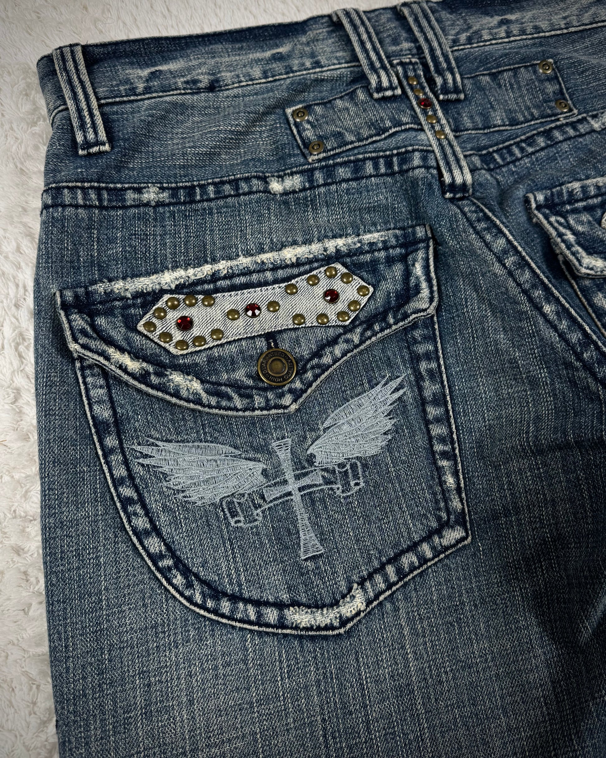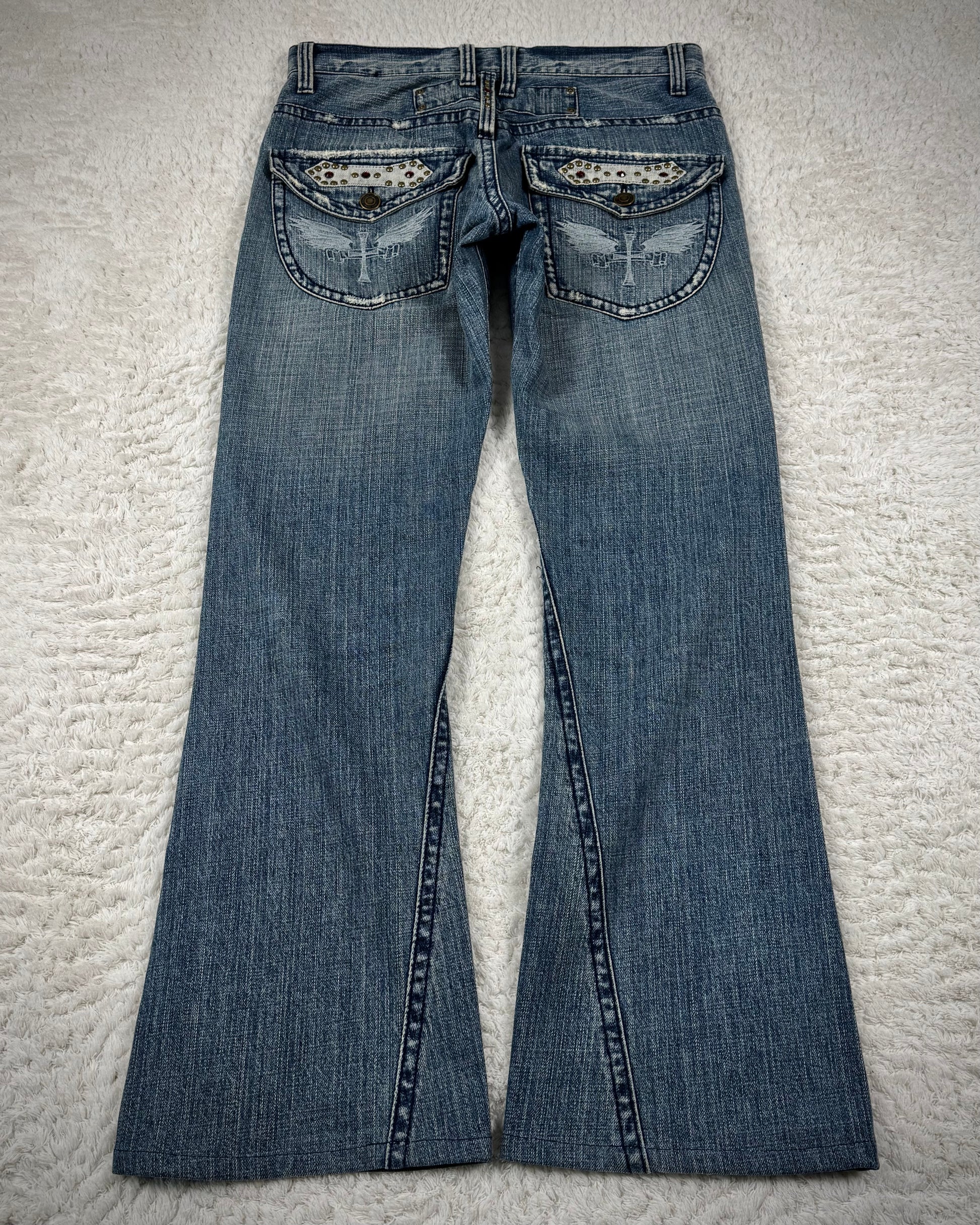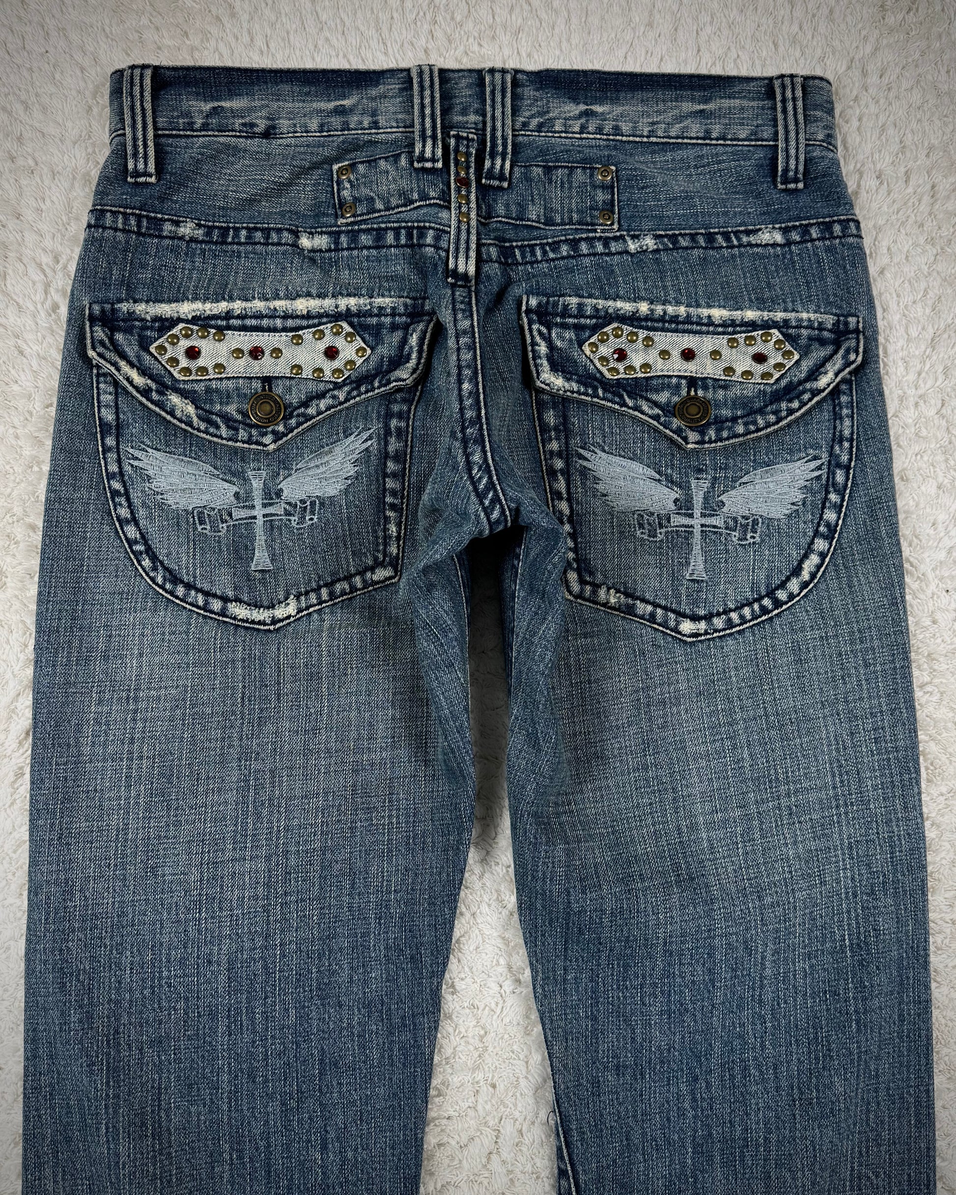 These flared jeans from Japanese brand Ultimax feature a subtle whisker wash. The back pockets are adorned with winged crucifix embroidery, while the flaps are detailed with studs and red crystals.