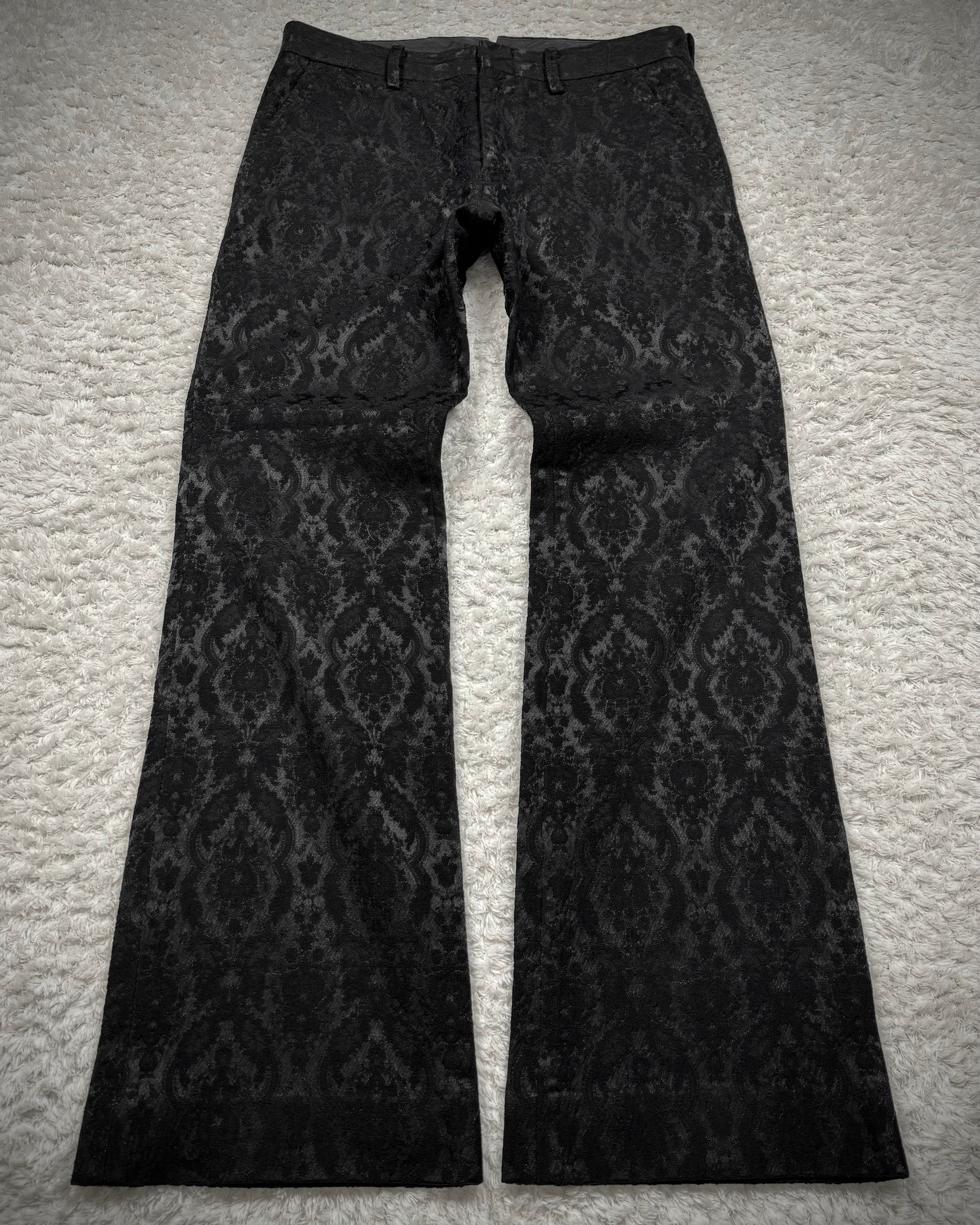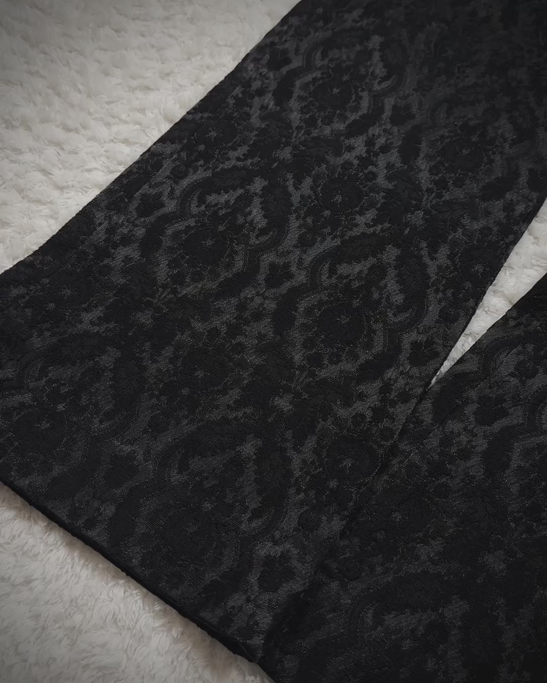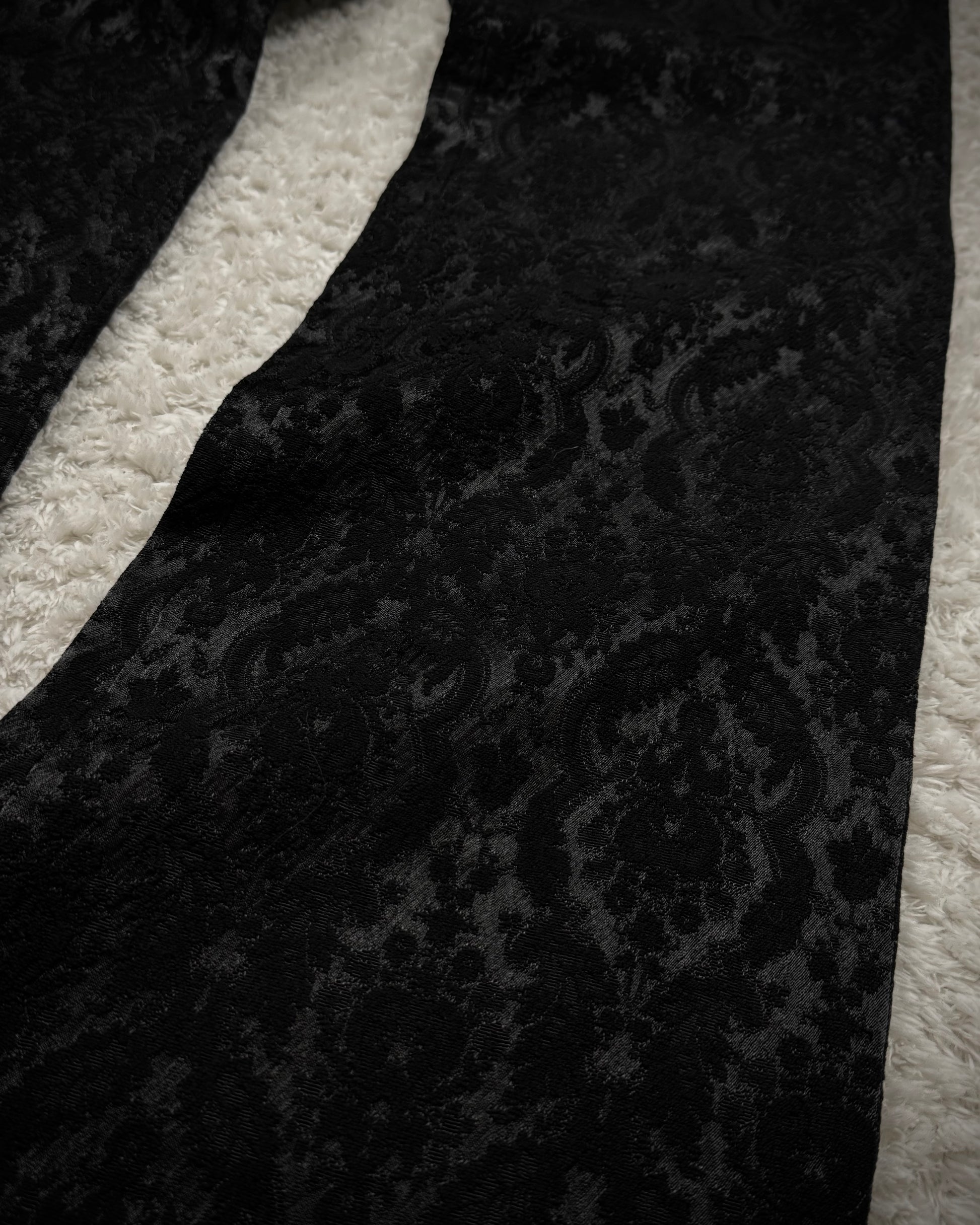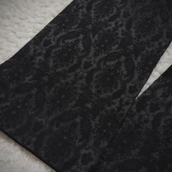 These bootcut dress pants from Japanese brand Utaki feature a shadowy baroque pattern woven into the seam structure, creating a textured depth that responds to lighting. The craftsmanship emphasizes unique detailing and comfort throughout.