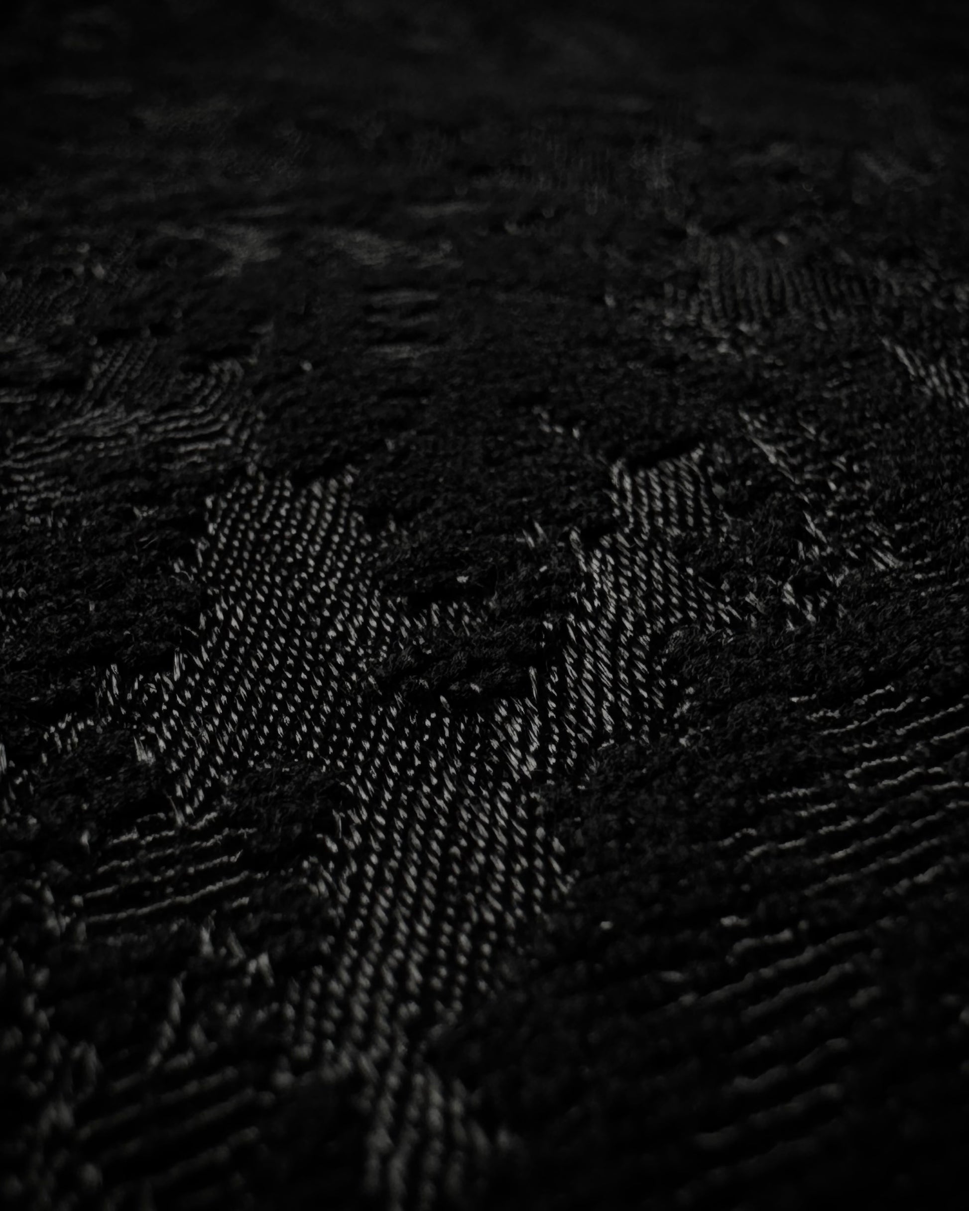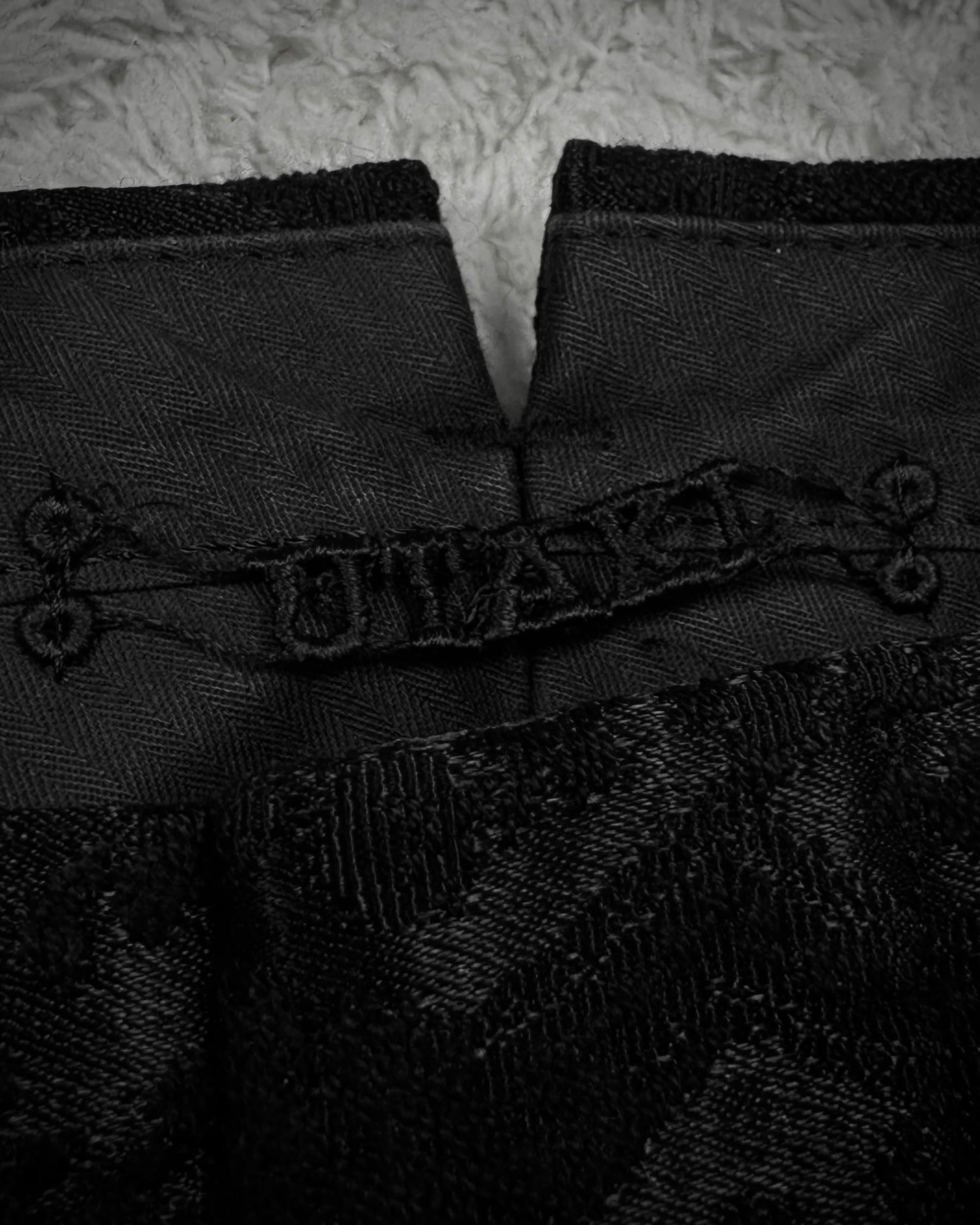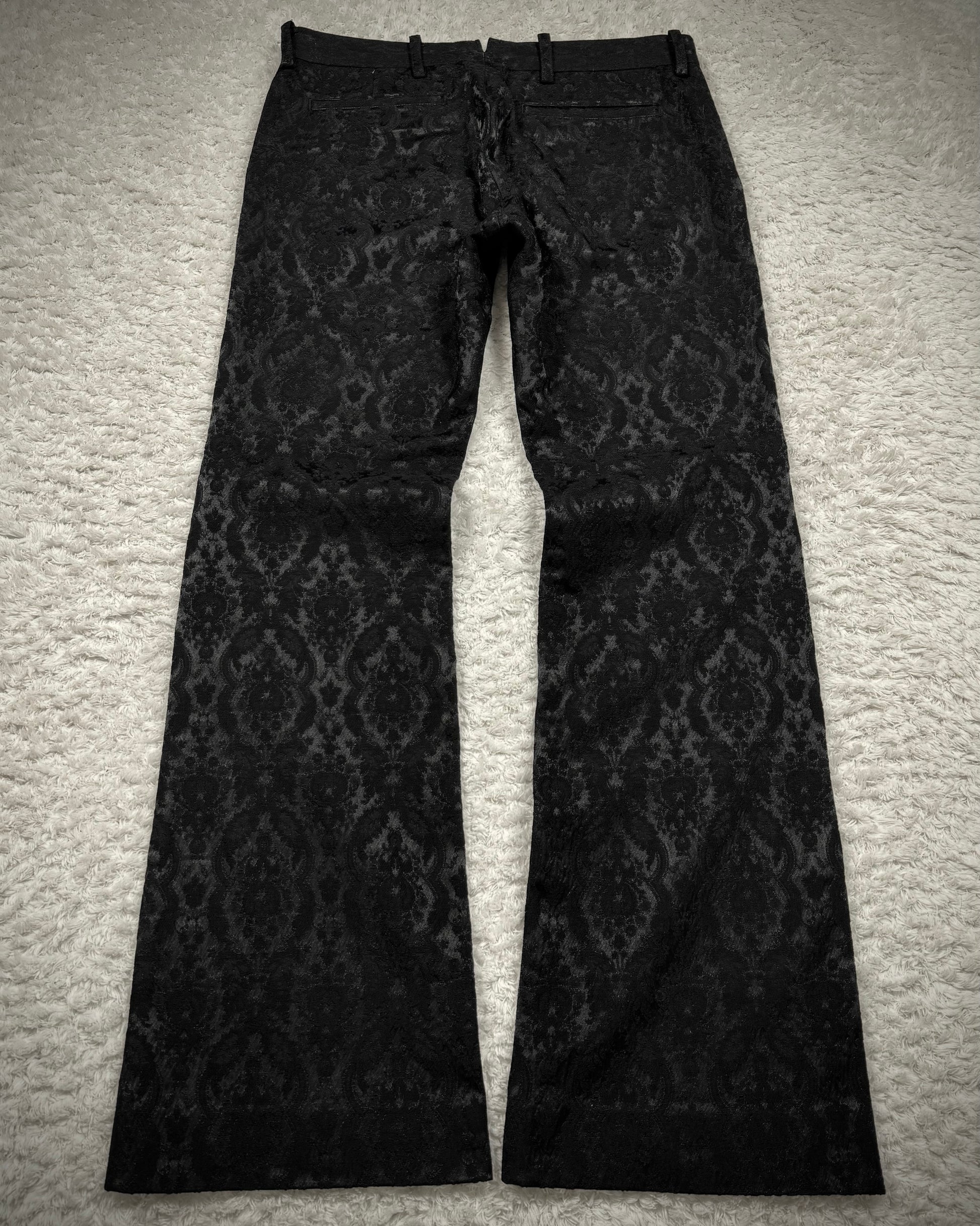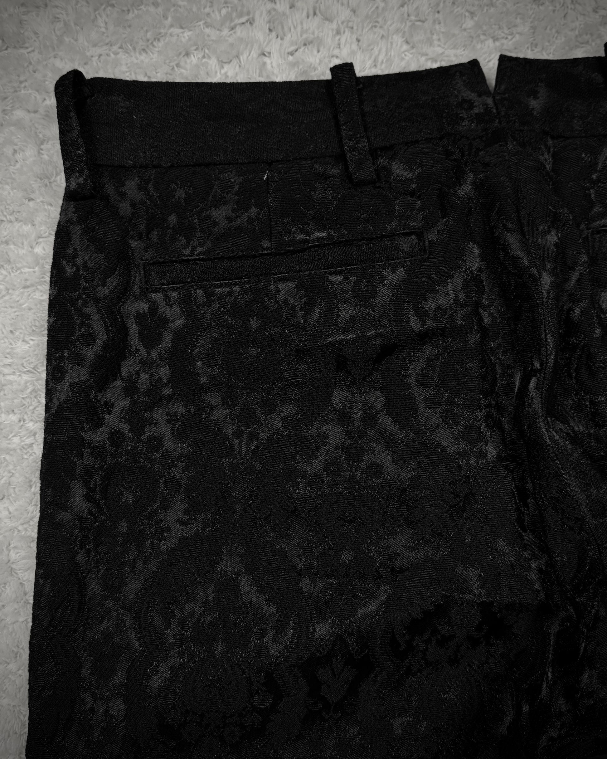 These bootcut dress pants from Japanese brand Utaki feature a shadowy baroque pattern woven into the seam structure, creating a textured depth that responds to lighting. The craftsmanship emphasizes unique detailing and comfort throughout.