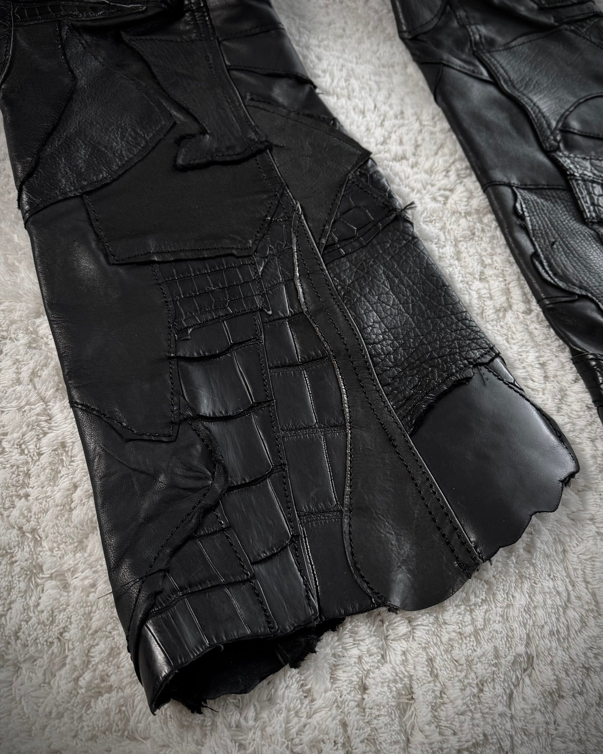 These Yasuyuki Ishii pants feature a raw leather patchwork design crafted from deerskin, alligator, crocodile, and snakeskin. They have raw hems and belt loops, with snakeskin crosses on the back pockets. The interior is lined with smooth silk for comfortable wear.
