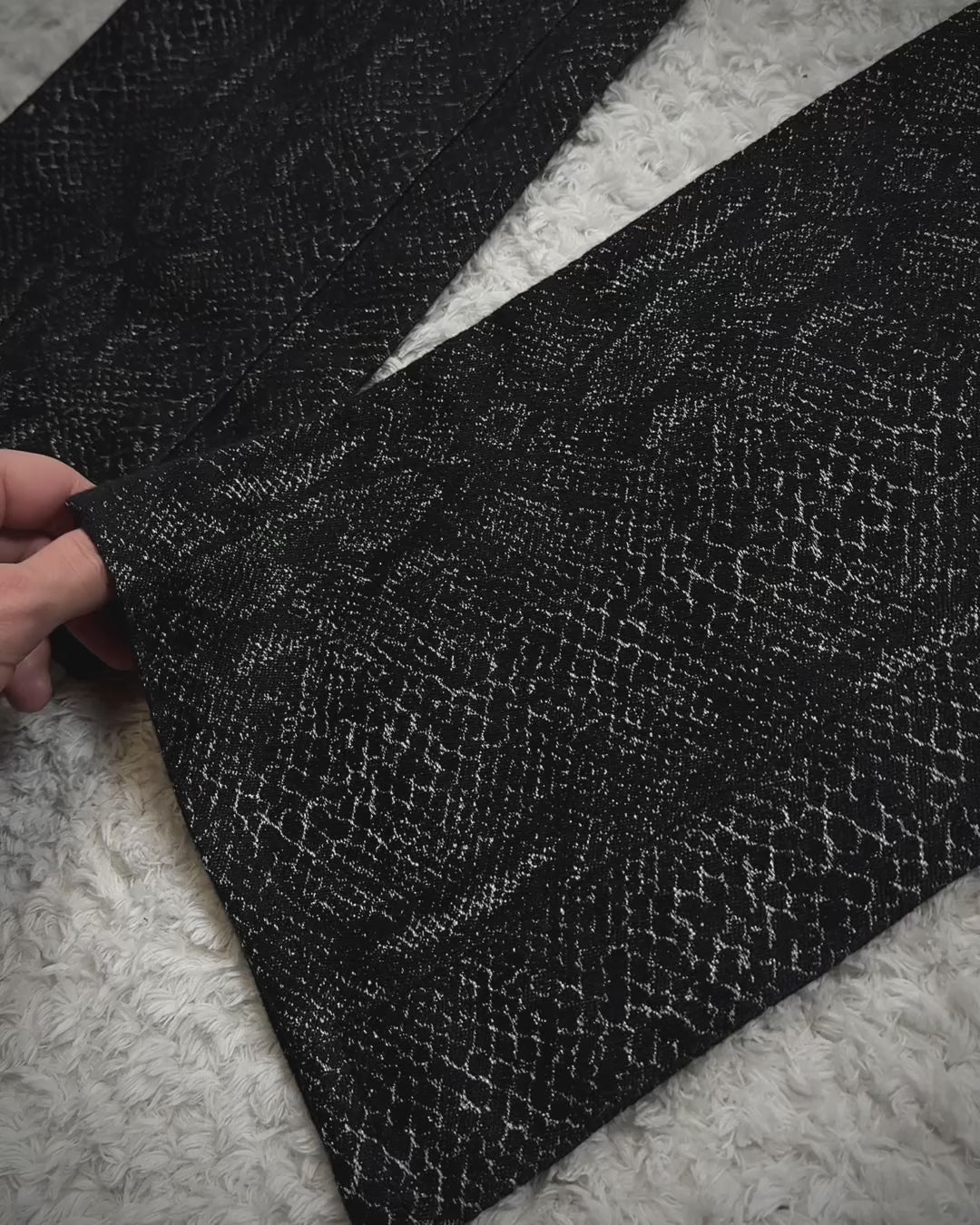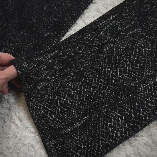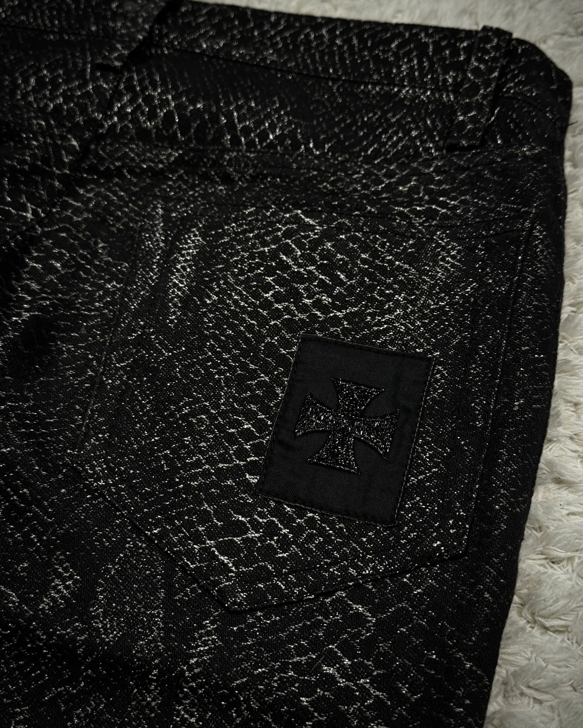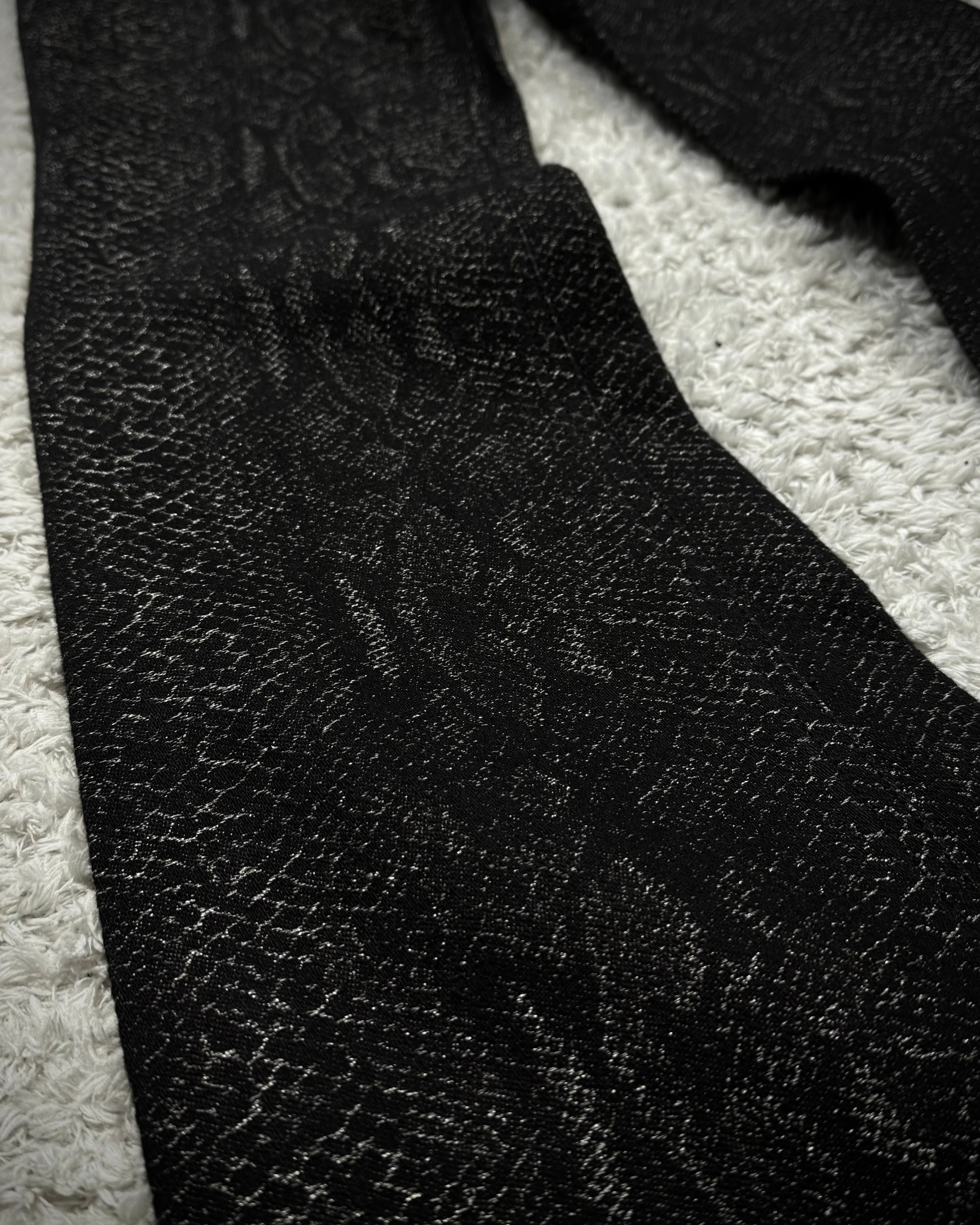 These flared pants from Japanese brand Yasuyuki Ishii feature a python pattern woven in a jacquard style with silver threads integrated into the seams. The pattern shimmers depending on the lighting and is finished in a slim, elongated silhouette.